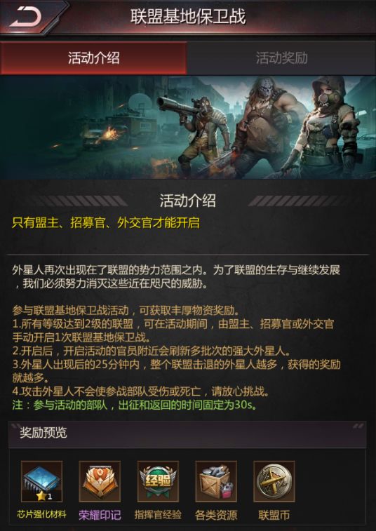 外星人再次出现在了联盟的势力范围之内。为了联盟的生存与继续发展我们必须努力消灭这些近在限尺的威胁! 一、基本说明 开启条件:2级联盟以上,盟主、招募、外交才可开启。 时间:每个星期的周二与周四,准备时间5分钟,攻击时间20分钟。 建议指挥官们开始前把所有兵力召回避难所、更换为攻击天赋、大规模行军。 二、玩法介绍 开始后有5分钟的准备时间,基地附近会出现黄色圈圈(总共11个),圈圈的位置会在开启者的