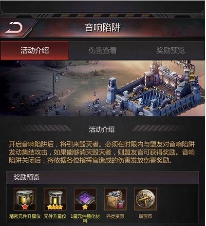 音响陷阱由盟主或官员手动开启。开启后,会引来毁灭者,必须在30分钟内与盟友对音响陷阱发动集结攻击。如果成功消灭,则盟友皆可获得奖励。消灭之后可以继续攻打,按照伤害计算会获得更多奖励音响陷阱关闭后,依据各位指挥官造成的伤害发放伤害奖励。奖励内容可以点选[信件]-[系统公告]寻找音响陷阱奖励信件。一、设置条件与开启限制联盟等级须3级以上才能设置音响陷阱,刚开始只能开启1级怪,如果顺利消灭的话,下