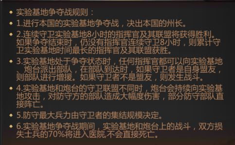 一.介绍1.背景:实验基地争夺战的结束并不代表永久的安逸,豪森特实验基地仍被各路人马虎视眈眈,所有人都伺机而动,企图将他收入囊中。2.地点:各国家的正中间会有个实验基地、周边砲台、周边废土,避免其他国家的避难所占领上述区域。3.时间:隔周六10:00-22:004.对手国家与分组段位:系统会依照各州实力做段位匹配,每个国家会有一或两个对手国家。(1)奖杯段位:青铜、白银、黄金、白金、钻石