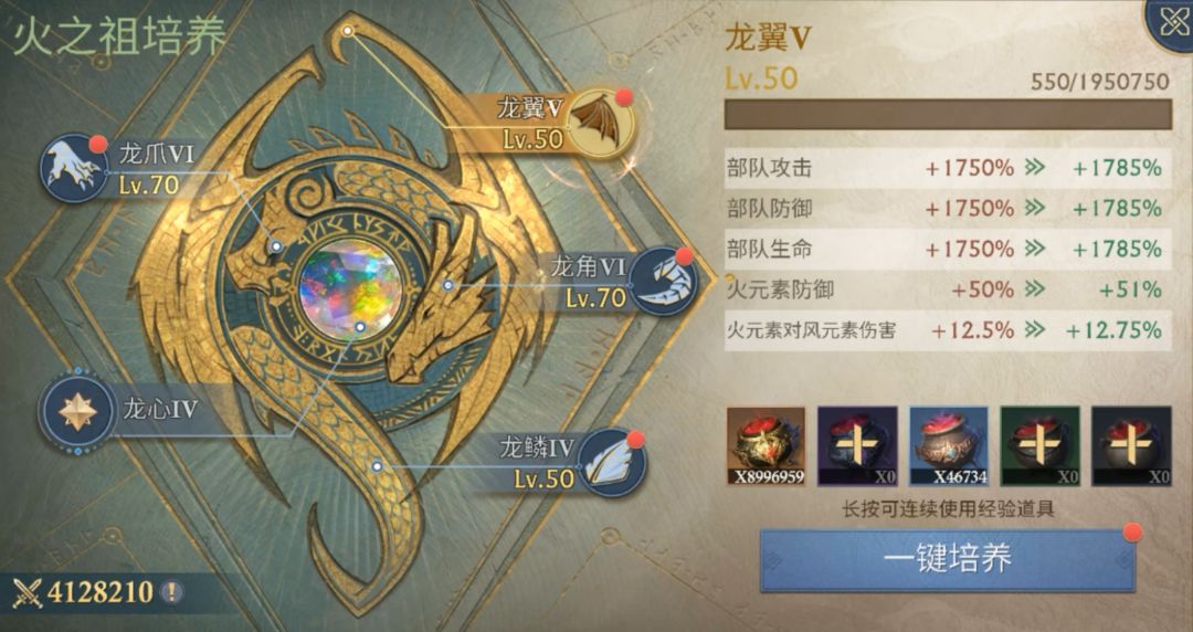 在《阿瓦隆之王》中,领主要塞30级且巨龙三星以上可开启巨龙幻化系统,在幻化界面可对巨龙各个部位进行养成,也可召唤火元素、风元素、土元素或水元素巨龙为队伍提供不同的加成。今天给大家带来巨龙幻化玩法策略解读,帮助大家利用这个系统最大化提升战力。 一、养成及资源获取 始祖巨龙为万龙之祖,领主们可在龙殿中祈祷召唤掌控火元素、风元素、土元素、水元素的始祖巨龙。召唤对应元素始祖巨龙后,每个队列出战可根据“实际