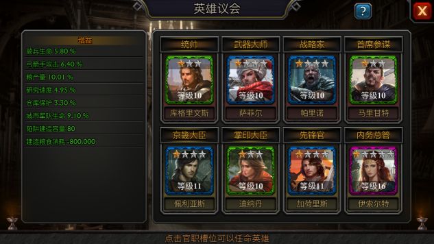 如浩瀚星辰闪耀,如太阳光辉洒落,漫漫时空,英雄之名,永垂不朽!英雄概览:· 英雄可以从名为“英雄议会”的建筑中获得并使用。该建筑位于龙魂神殿的旁边,需要要塞等级10级解锁。· 英雄不仅拥有强大的能力,也有出众的外表。当你任命英雄担任合适岗位时,会获得强大的加成。加成一直有效,而英雄是无法参战的。· 英雄可以升级,升级后的英雄其加成和星级将得到强化,从而解锁更多附加效果。英雄图鉴:英雄
