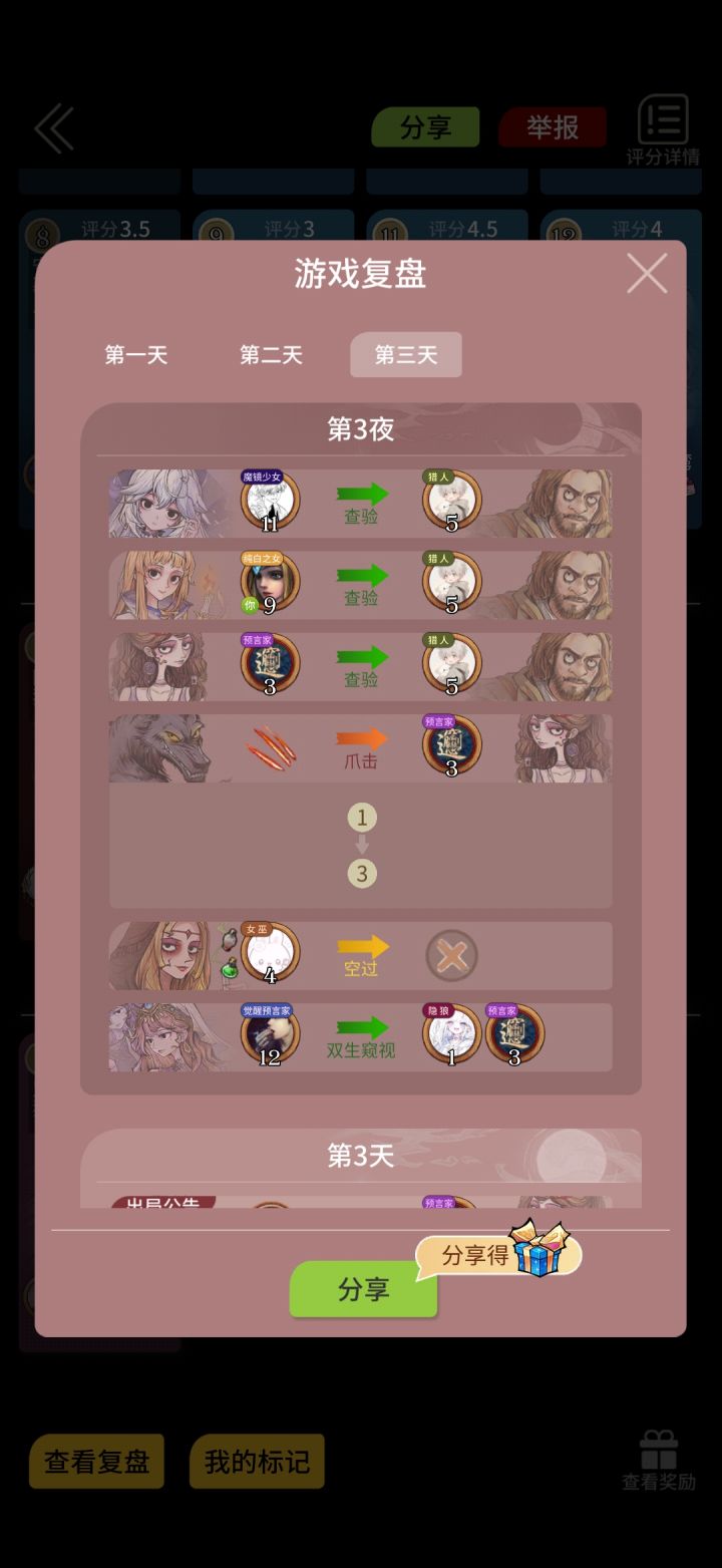 第二天狩猎三狼美,狼魅惑四四被守。第三天狩猎一,一被守。第四天终于把三狼美狩猎出局。其中九号偷商人技能给狼同伴,被弹死。