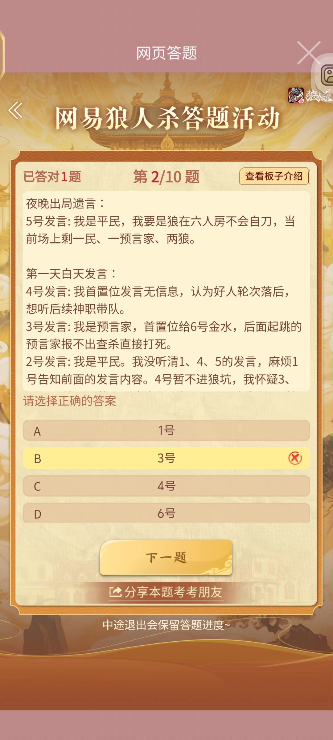 1的话有点问题,按照题目背景来说,这些发言应该在警上完成,这时候可以通过看上警结束时的刀口判断D的女巫真实性,这里假设D报的刀口是对的,设后置位对跳女巫的玩家是E,此时CE肯定共边,AB必出一狼,如果CE真是双狼的情况下,那么场上3狼位置明确,狼队通常不会玩这么大,我个人偏向于认BCE三好AD双狼,但是实际情况还得受各方面影响,最优解应该是留着晚上DE互毒[嗒啦啦2_吃瓜]另外,警上双药女巫被查杀要看情况,如果后置位还有很多牌我觉得是不该跳,后置位没牌了确定不存在狼人补跳的可能的情况下应该跳,保证警徽进真预手里
