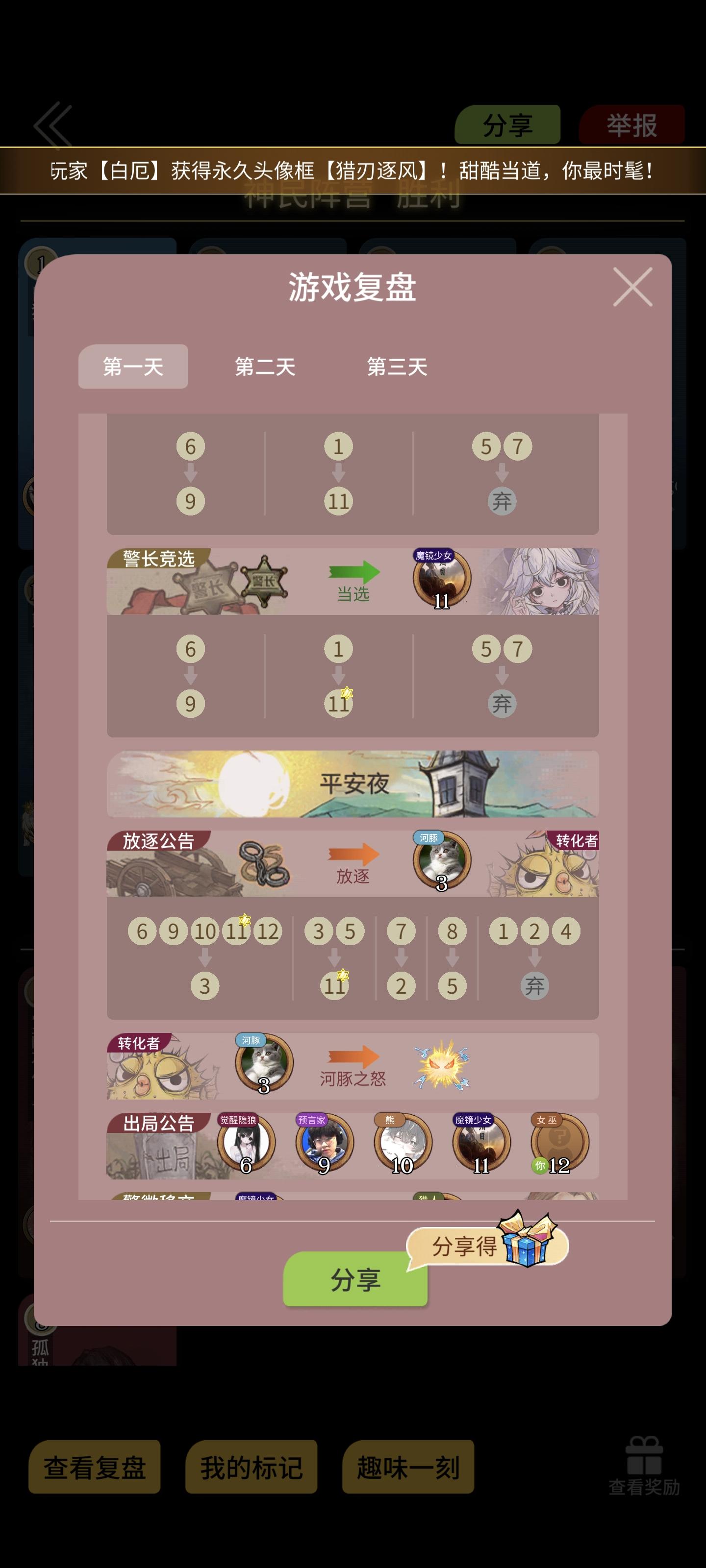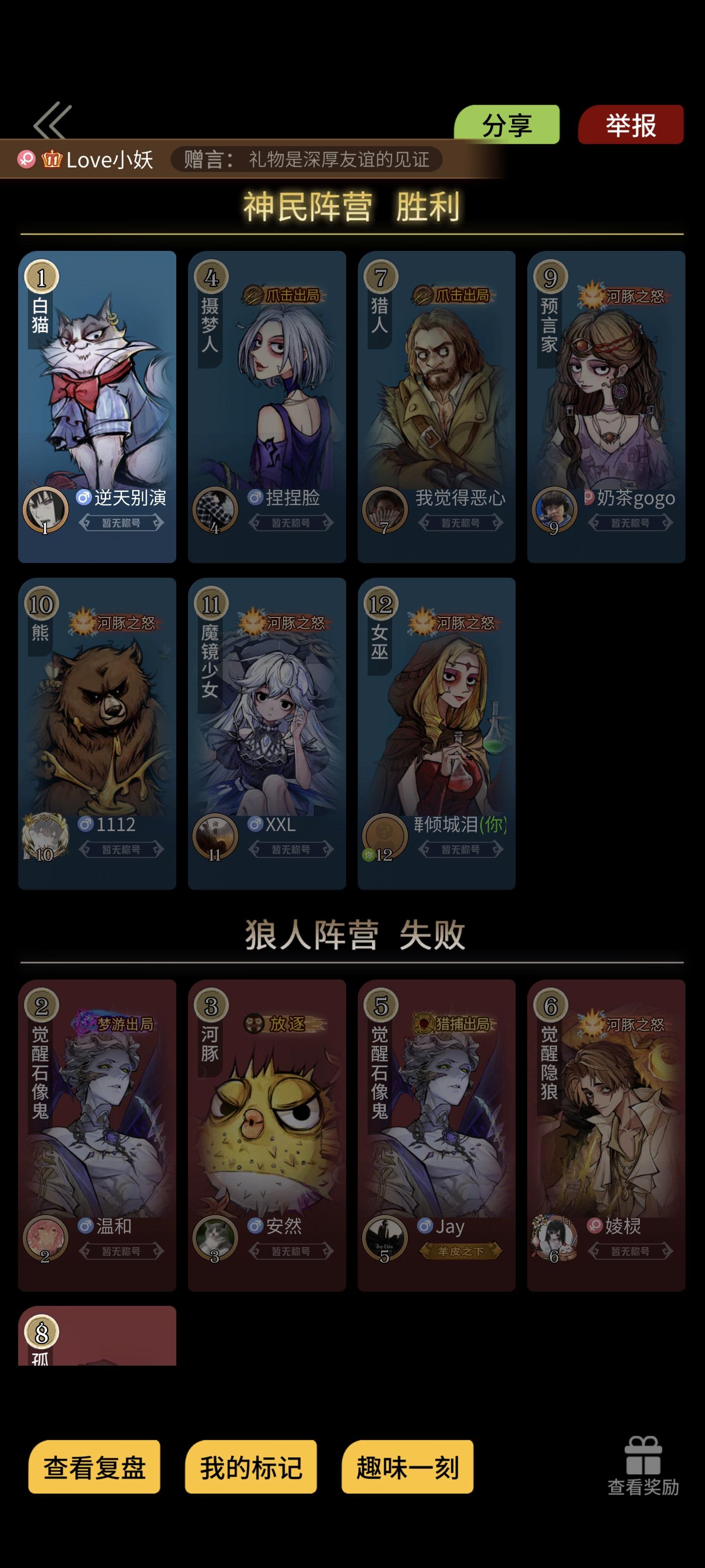 开局,顺序发言,从10开始,11预言家,12平民6小狼起跳,给4发平民,9大哥起跳给1发守卫身份无一人发爆,警下78,8给9投票,7没投,然后78,从头到尾都在挂机。69,聊炸,6警上不聊78,警徽10,1,警下说9机械猎人,不改警徽。9警下跟扯,5,2验,2跳出来女巫了。逆序发言,11怂预言家,不敢下9,10倒钩,说下9,9还聊差的一批,只能给9大哥冲了。晚上我们刀1,2把6毒了。这