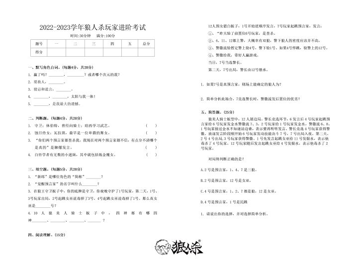狼人杀官方2022-2023学年玩家进阶考试,现在开始!