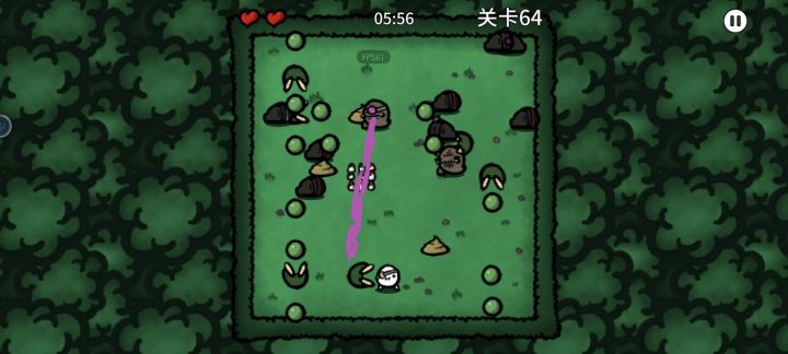 作为一个单机游戏 那必须可以暂停 请看右上角 点击后可以看见返回主菜单 主菜单第一个就又是继续 这时候我们就可以发现了 在没打完的一关内 你退出加重进 一切包括血量 进度等等都会回到开局的状态 我暂且称之为"刷关"(跟元气骑士很像 但他可以无限刷)最精髓的部分就是刷关了 只要我们有两颗血 当掉血后角色会进入一段无敌时间 只要抓住时机刷关就可以实现准无敌了 容错率自然提高 这个游戏主要就是血的问题