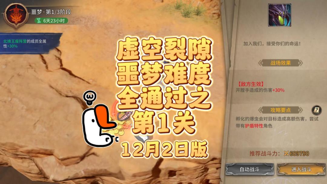 在《潮汐守望者》这款游戏中,噩梦难度的虚空裂隙是一个极具挑战性的副本。以下是一些攻略建议,帮助玩家更好地应对这一挑战: # boss技能与应对策略 1. 影蛛女皇:落石 - 技能描述:影蛛女皇会召唤落石,优先攻击守护者职业,对及其周围一圈造成高额伤害1。 - 应对策略:需要防止奶妈和守护者被落石击中。建议玩家使用高输出角色来稳定提升队伍实力,同时确保守护者能够有效防守而不被秒杀1。 2. 免疫