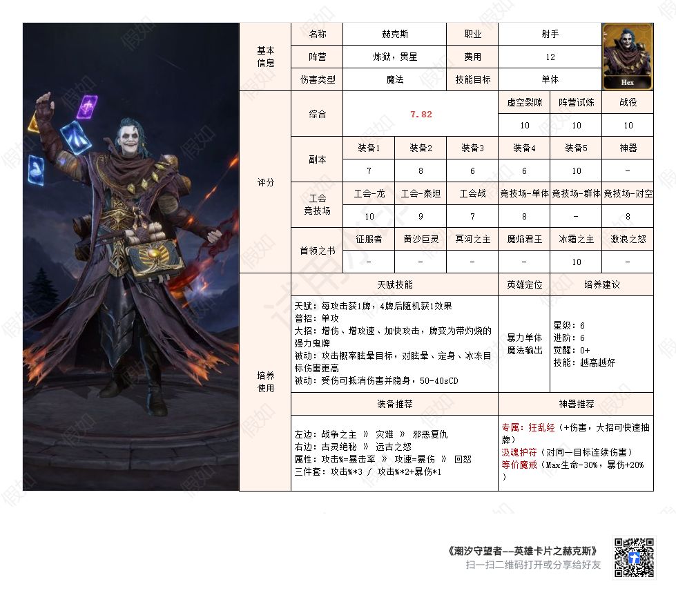 虽然被官方的固定顺序出卡设定、装死、招水军发垃圾图等行为恶心到了,但是,还是想做一些事情。 游戏内容很多,但是我觉得英雄的培养是游戏的关键,而且在论坛中经常可以看到很多人问要培养哪个英雄,于是就有了这个想法,将一些比较热门的英雄的培养要点以卡片的形式整理出来,以供参考。 卡片内容大部分来自于游戏,部分来自于论坛,再加上个人理解。 由于英雄众多,玩法多样,个人进度及体验等影响,个人理解不见得透彻,如