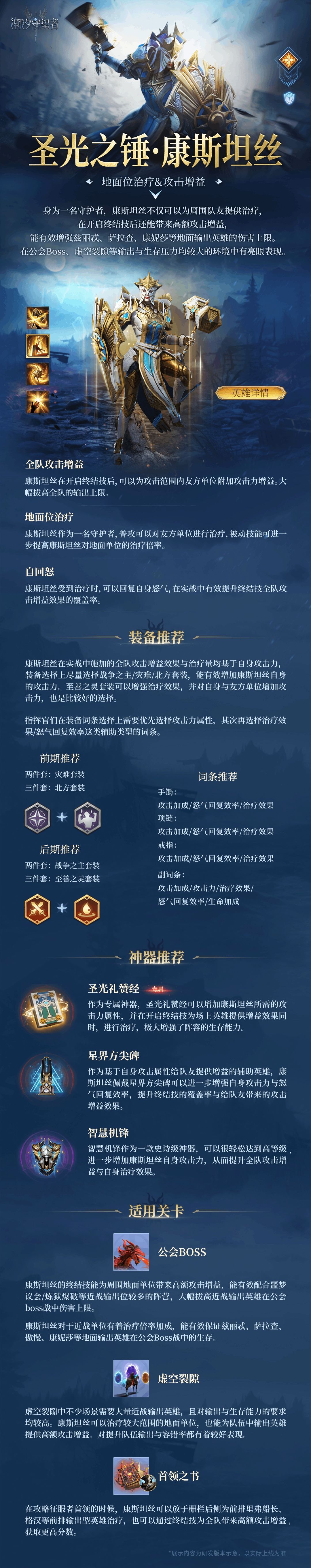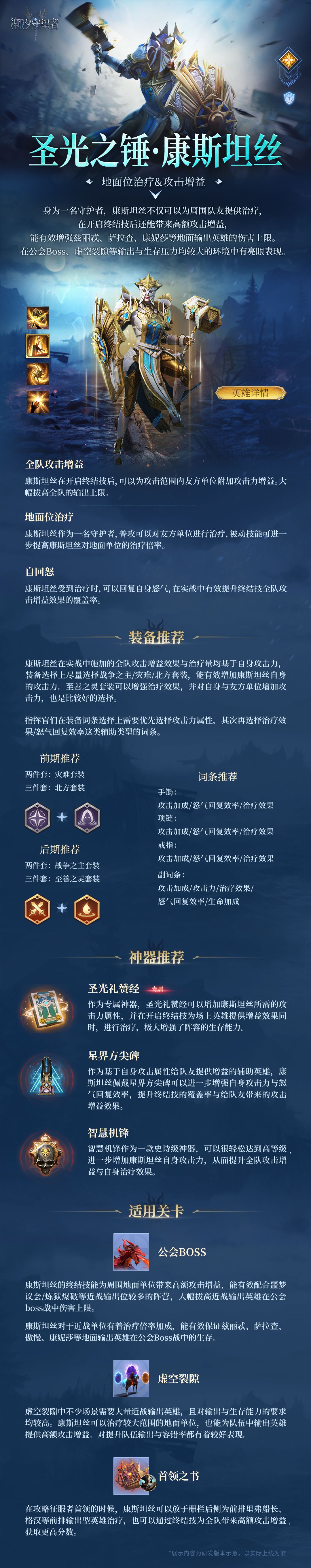 身为一名守护者,康斯坦丝不仅可以为周围队友提供治疗,在开启终结技后还能带来高额攻击增益,能有效增强兹丽忒、萨拉查、康妮莎等地面输出英雄的伤害上限。 在公会Boss、虚空裂隙等输出与生存压力均较大的环境中有亮眼表现。