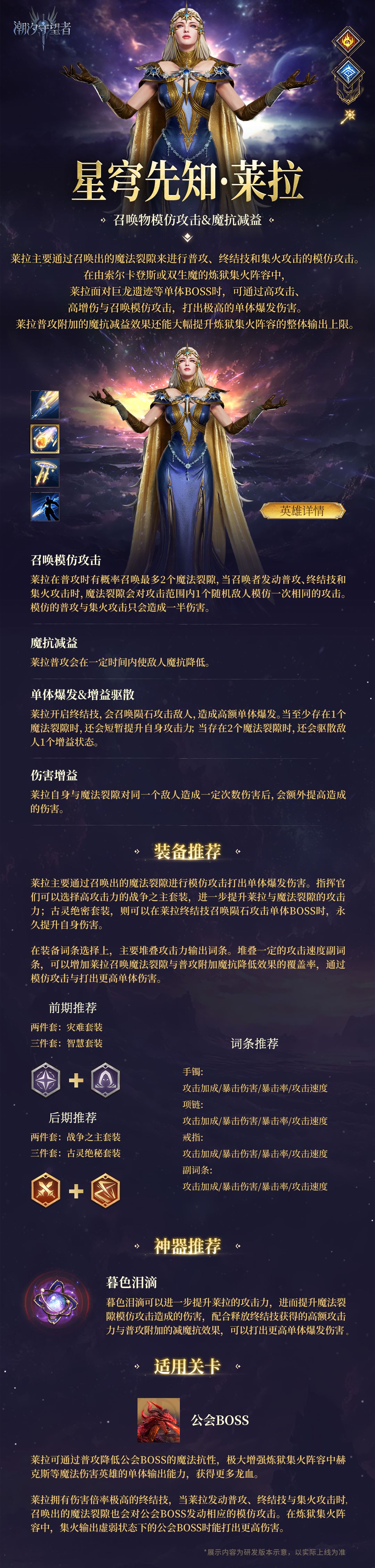 莱拉主要通过召唤出的魔法裂隙来进行普攻、终结技和集火攻击的模仿攻击。在由索尔卡登斯或双生魔的炼狱集火阵容中,莱拉面对巨龙遗迹等单体BOSS时,可通过高攻击、高增伤与召唤模仿攻击,打出极高的单体爆发伤害。莱拉普攻附加的魔抗减益效果还能大幅提升炼狱集火阵容的整体输出上限。