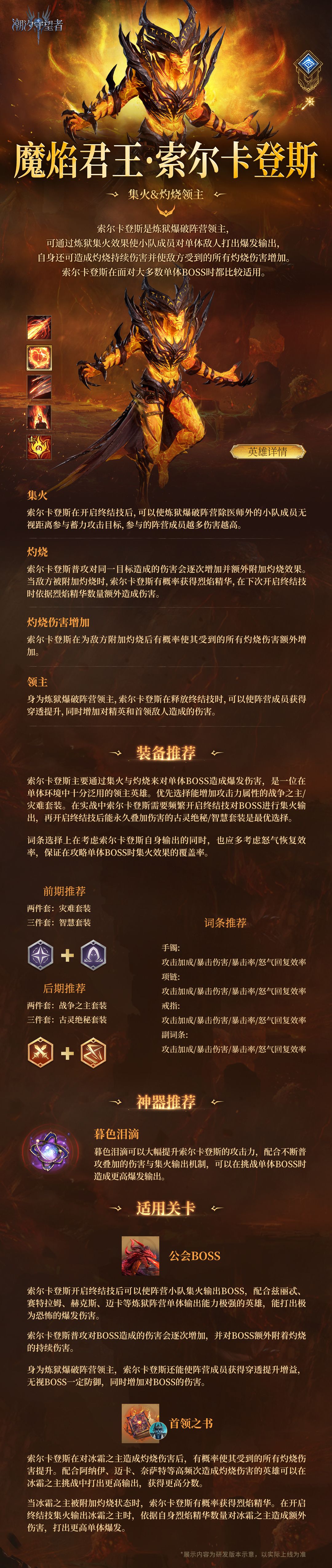 索尔卡登斯是炼狱爆破阵营领主,可通过炼狱集火效果使小队成员对单体敌人打出爆发输出。自身还可造成灼烧持续伤害并使敌方受到的所有灼烧伤害增加。索尔卡登斯在面对大多数单体BOSS时都比较适用。