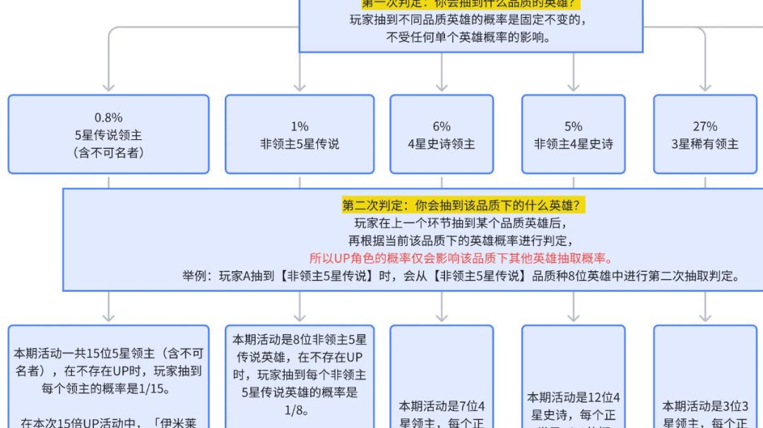 图片是官方自己发的,宣传的是概率提升15倍。那么我们计算一下: 根据官方说的先判定抽卡品质,5星领主每个的概率是0.8%,总共15个5星领主(含不可名者)。 那么他是怎么实现15倍UP的呢?搞不清楚,可能有两种方案: 方案一:直接提升概率到15倍,因为5星领主卡池是15个,概率从1/15*0.8%=0.0533%,提升到1/15*0.8%*15=0.8% 方案二:往卡池里再填充14张UP卡。 首先