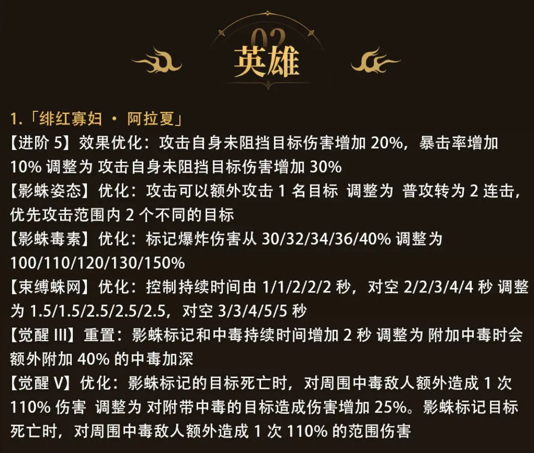 《潮汐守望者》将在7月26日到7月28日(23:59)会开放新一轮的特定远古召唤卡池,在活动期间抽取阿拉夏、杜尔伽的概率将提升20倍。今天给大家带来阿拉夏增强解读及杜尔伽适性简析,小伙伴们在抽卡前可作为参考。 一、阿拉夏增强 阿拉夏在7月10日进行了加强: 1、进阶5可额外对未阻挡目标提升30%伤害; 2、被动可将普攻转为2连击,优先攻击2个不同的目标;3、影蛛毒素可造成更高的爆炸伤害,也能用来清