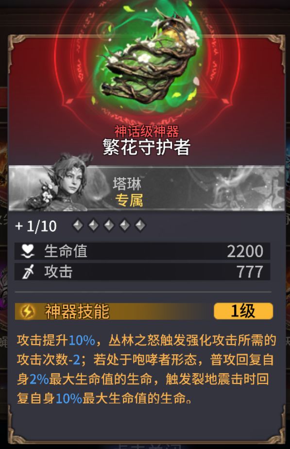 《潮汐守望者》将在8月进行大版本更新,除了杨戬、哪吒这两位重磅英雄以外,还新增了一大堆专属装备、专属神器。今天给大家抢先带来新专武、专属装备评测,小伙伴们可以先了解下相关变动,以下内容为测试服数据,仅供参考,实际数值、效果还是要以正式服为准。 一、专属神器 1、塔琳——繁花守护者 塔琳是7月新英雄,不知道大家有没有抽?专武可降低“丛林之怒”强化攻击的次数,相当于6次攻击就能造成一次480%系数伤害