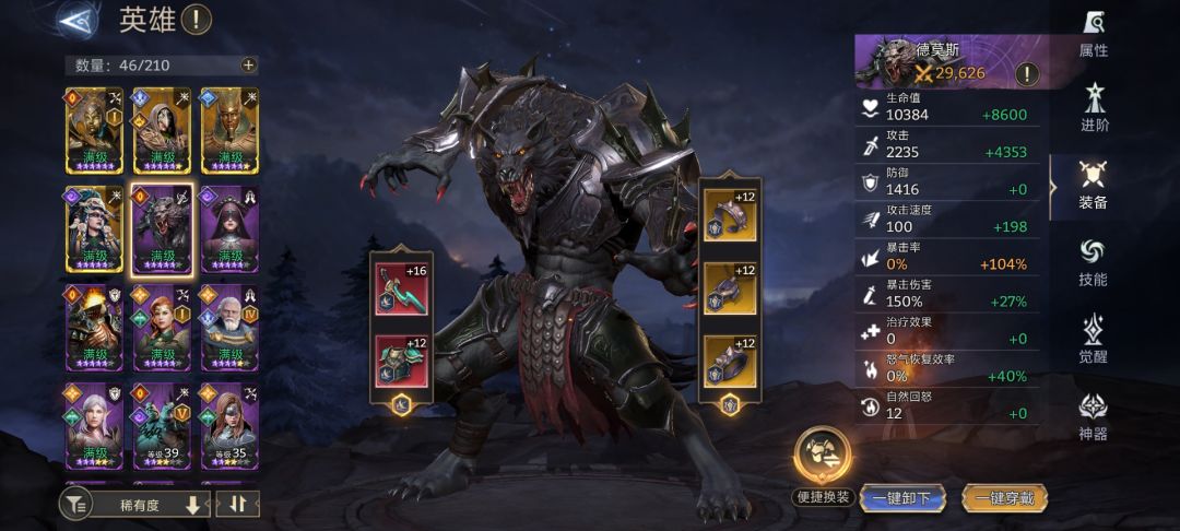 狼人哥打龙本和神器本一绝,一顿小刺挠,两万多的装备分已经比快五万分的哈苏输出高一倍了,顶级单体输出,变身以后直接上演血条消失术。 其实这游戏,主线难度不高。 几个有难度的点。 第一个就是装备本1,很重要,是武器的来源,这游戏装备给的数值非常夸张,有没有好装备完全是两个游戏,这个本刚需两个aoe法师,11关是个跨度,没强力aoe法师包打不过的,所以开局池子的法老和贪婪就成了破局的关键。 第二个是工会