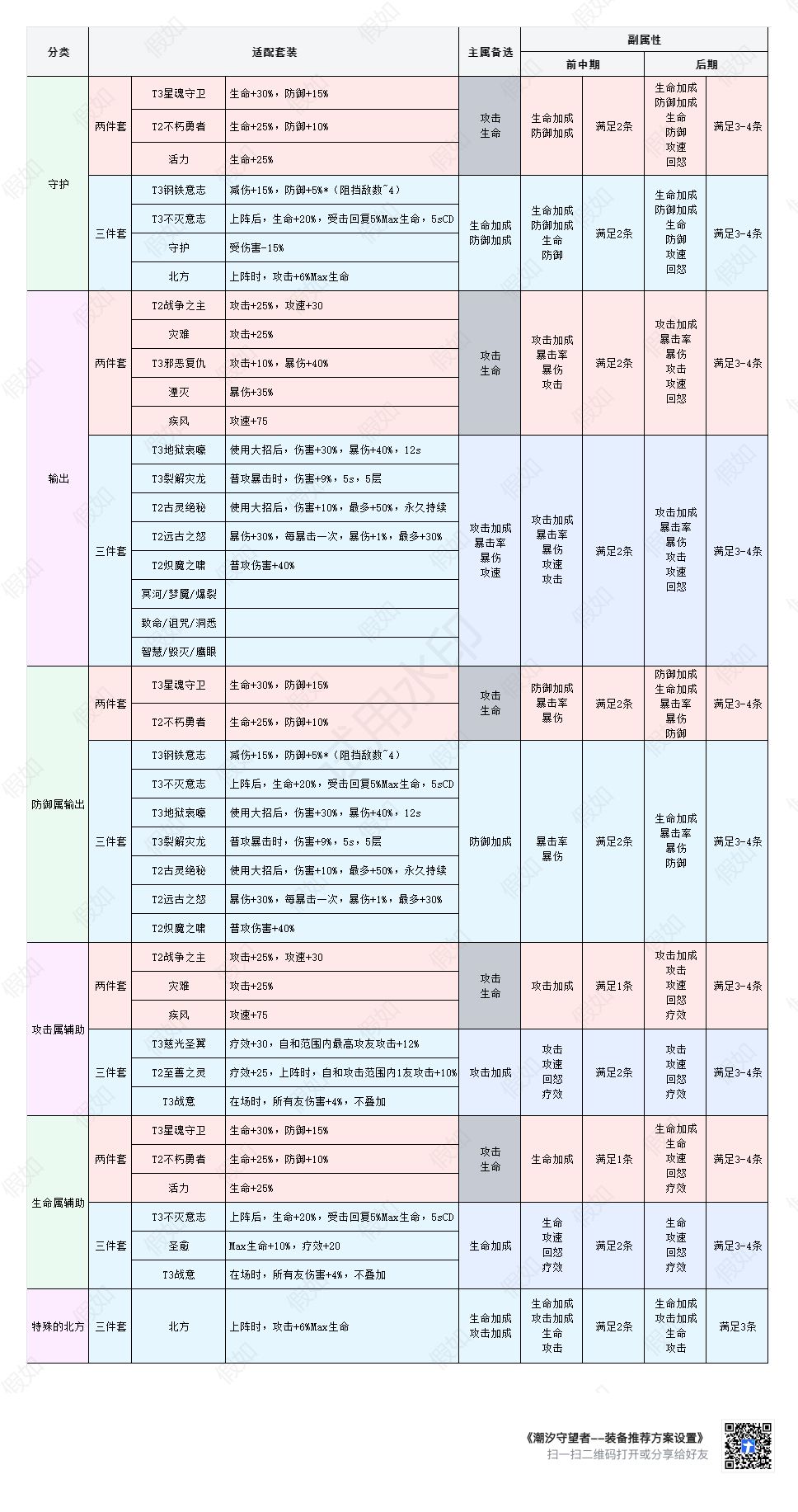 游戏配有装备推荐系统(在装备上显示大拇指),但是有些时候推荐的装备很奇怪,于是花时间对现有常用英雄的常用装备进行整理,总体上可以分为五类: 守护,即T,以生命、防御等为主要属性; 输出,即战士、法师、射手,以攻击、暴击率、暴伤、攻速等为主要属性; 防御属输出,即基于防御计算伤害的输出守护,以防御、暴击、暴伤等为主要属性; 攻击属辅助,即基于攻击计算治疗量的治疗及辅助,主要以攻击、疗效等为主