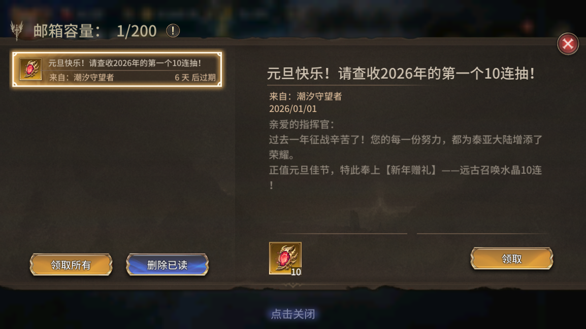 2026年1月1日-1月3日期间,登陆游戏,可在邮箱领取远古召唤水晶*10!兑换码:2026新年快乐 有效期:2025年12月31日-2026年01月31日————————————————————潮汐守望者「双旦许愿」版本现已开启!