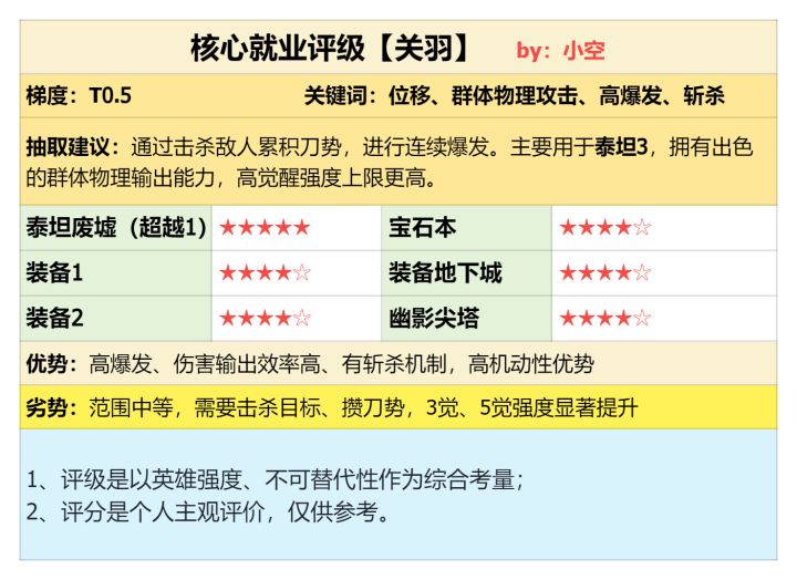 《潮汐守望者》将在2月16日到2月22日(23:59)会开放新一轮的特定英灵召唤卡池,在活动期间可自选传说英雄&关羽比其他同品质英雄将提升20倍,今天给小伙伴们带来新英雄关羽综合测评,在大家在抽卡、养成时可作为参考。一、关羽简评关羽的强度与刀势挂钩,刀势可提供回怒、无视防御、攻击提升等效果,击败敌人、累积刀势,可连续触发偃月斩打出高额爆发。因为大招有斩杀机制,所以更容易打出伤害、更容易积累刀势