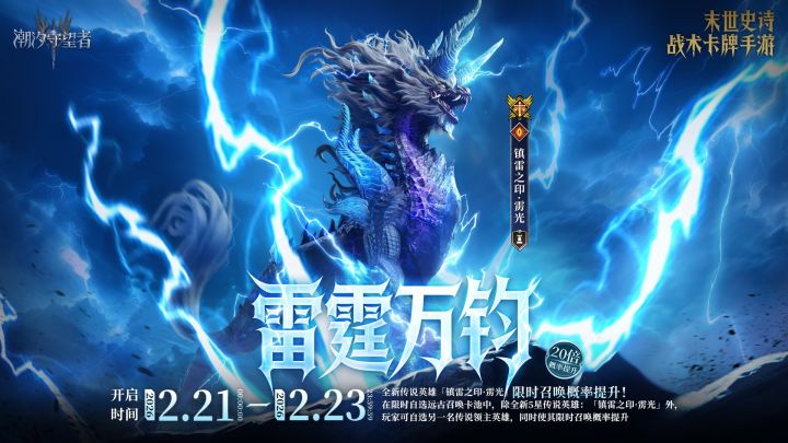 活动时间:2026年02月21日 00:00:00 - 2026年02月23日 23:59:59 参与条件:通关战役N1-9活动说明:在限时自选远古召唤卡池中,除5星传说英雄雳光外,玩家还可以从其他的传说领主(含不可名者)英雄中挑选1名提升其掉落概率。一旦在当前自选远古卡池进行召唤后,选择的提升掉率的英雄将无法更换。本期up英雄的掉落概率相比同品质的其他英雄提升20倍,同品质的其他英雄掉落概率