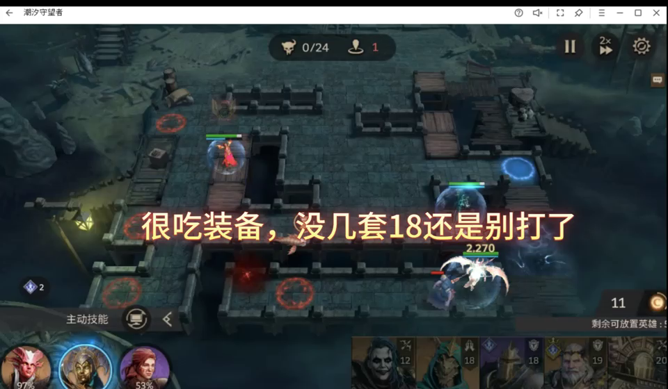 论坛很多攻略了,思路差不多 关键点几个: 1.右侧哈苏收三个小怪 2.绿弓大招收右侧单个大怪,大概平a1w出头就行3.中间前面二星毒弓和四星绿弓,绿弓后面站舞女,毒弓后面站新郎或小丑 4.左边鲨鱼收掉,可能第二波会漏,绿弓收或者打完boss马上撤新郎/小丑最后堵门。 #潮汐守望者新手攻略