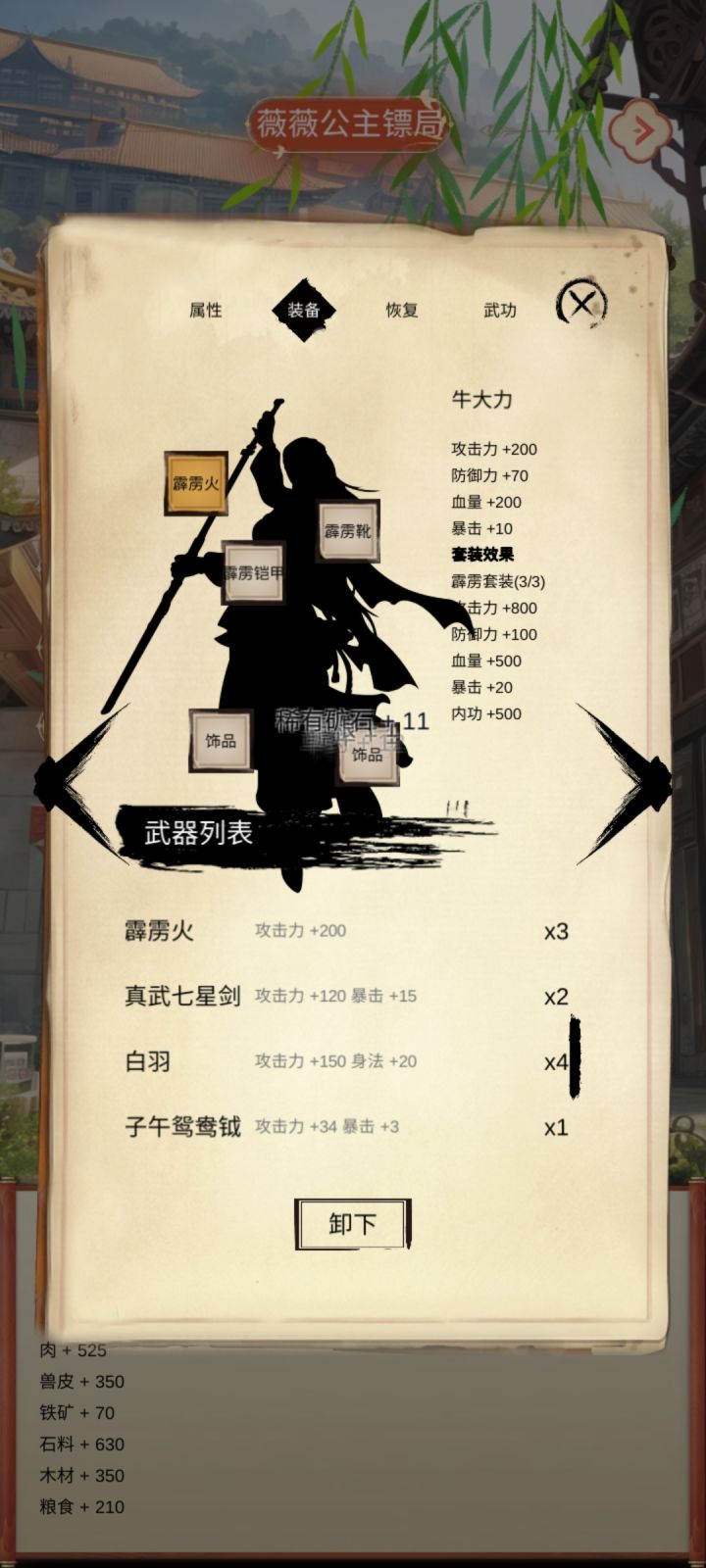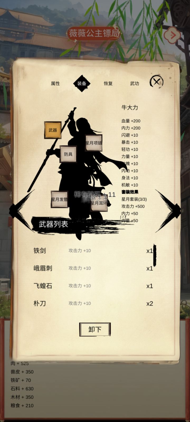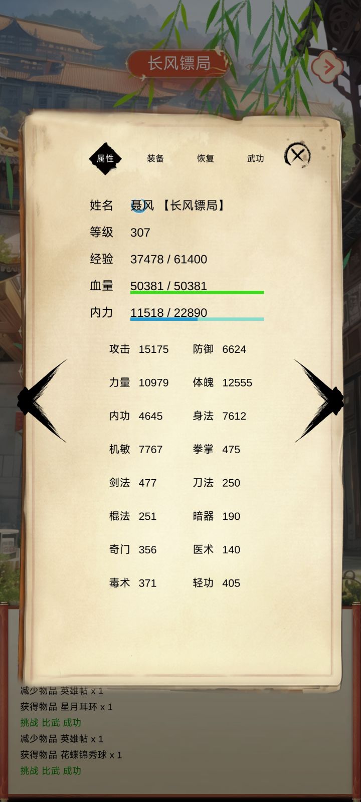 首先明确一点,所有的武功都可以练,我练了大概70种武功20种心法从数值上看我仿佛练的拳掌最多,剑法次之,实际上我既不用拳掌也不用剑法。很多武功都很好,但我选群攻,所以我先选了从挑战里出的星月神功,后面又改成了蛤蟆功。心法里有很多好心法,比如100%中毒,100%不中毒,100%反击,100%免疫异常,100%单体化群攻等等,但我选择了清心诀。因为蛤蟆功和清心诀都解异常状态,还群攻。装备我
