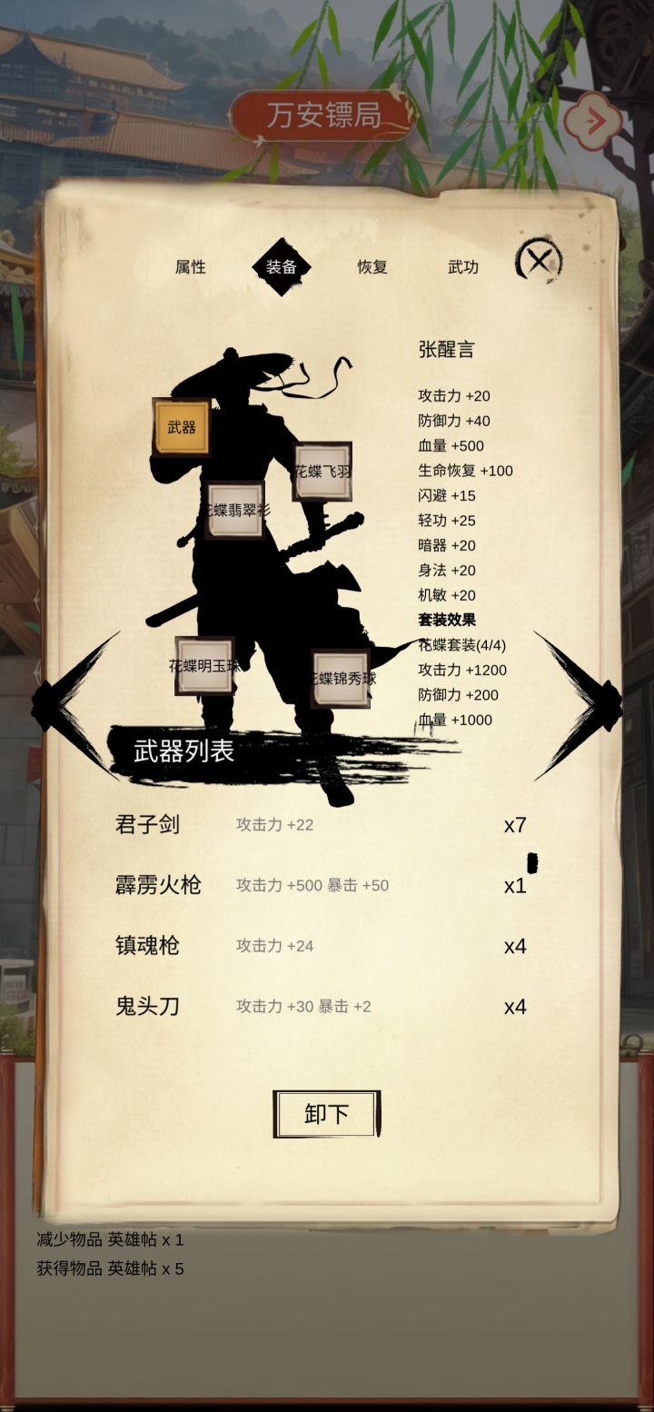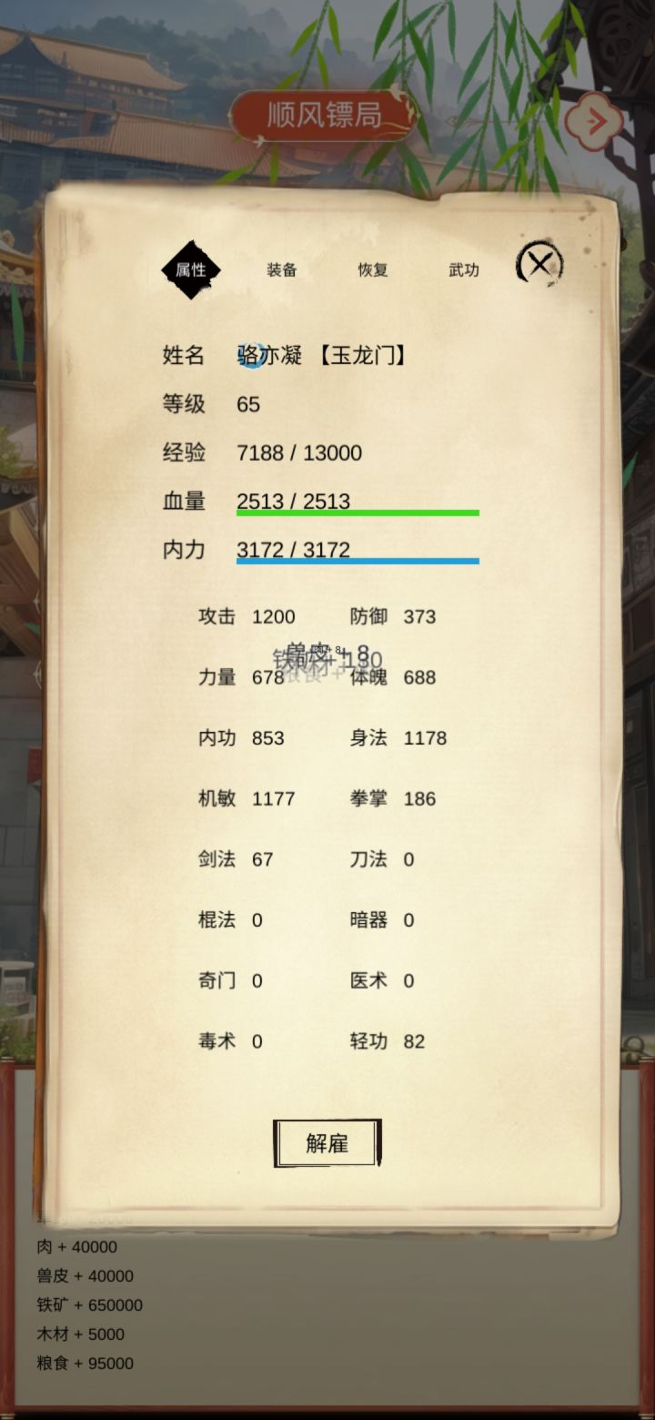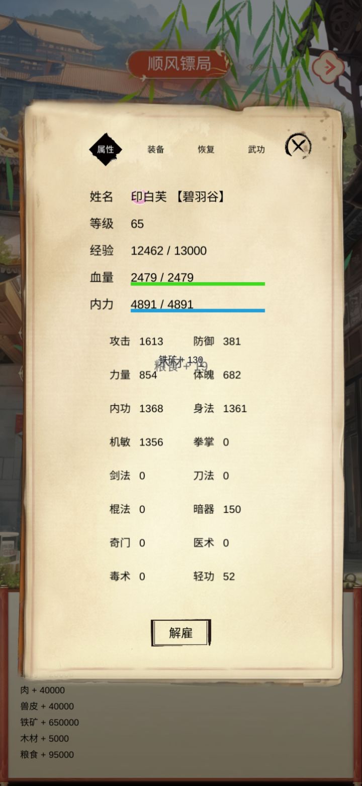 一、废话这门派好多啊,然而我到现在没看见一个群攻的侠客,真羡慕别人家的侠客,写累了,歇会-----突然发现作者是上次那款格斗游戏(划掉)的作者诶,哈哈没想到又遇上了。这次的文字游戏真的很好哦,加油。我继续抽卡,目前已经到五个重复两个的程度了,等重复五个我就开始运镖(什!?)目前来说,在低位池子里,感觉最推荐的是苏水青和甘笑旋,这两位是全体攻击的。其次就是洪白秋和申梦香啦,面板还可以。剩下的
