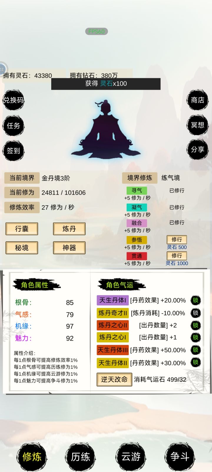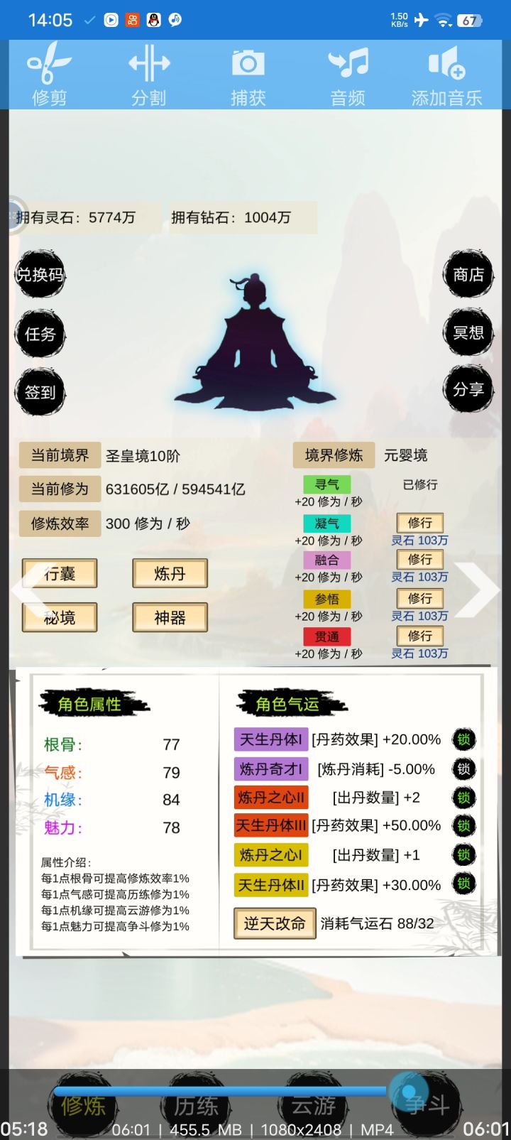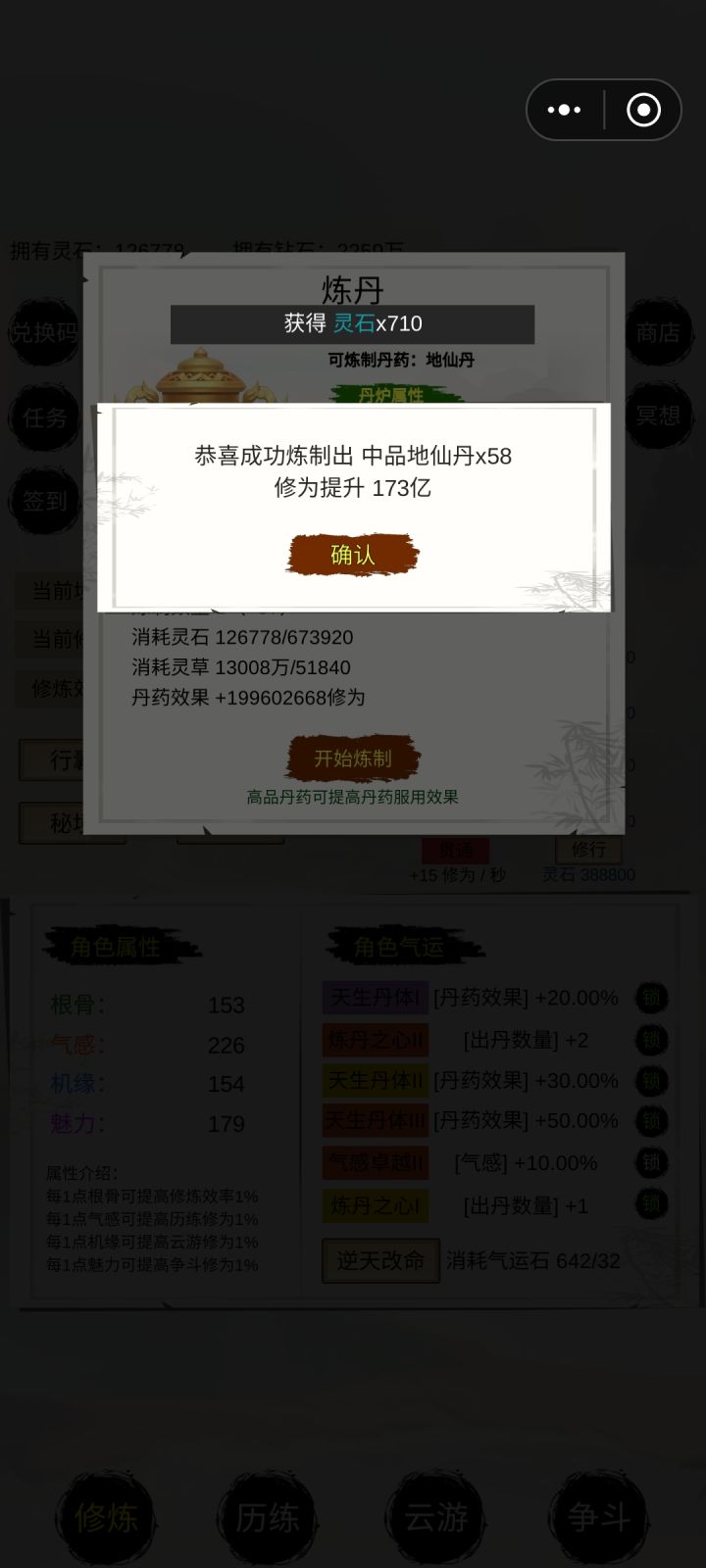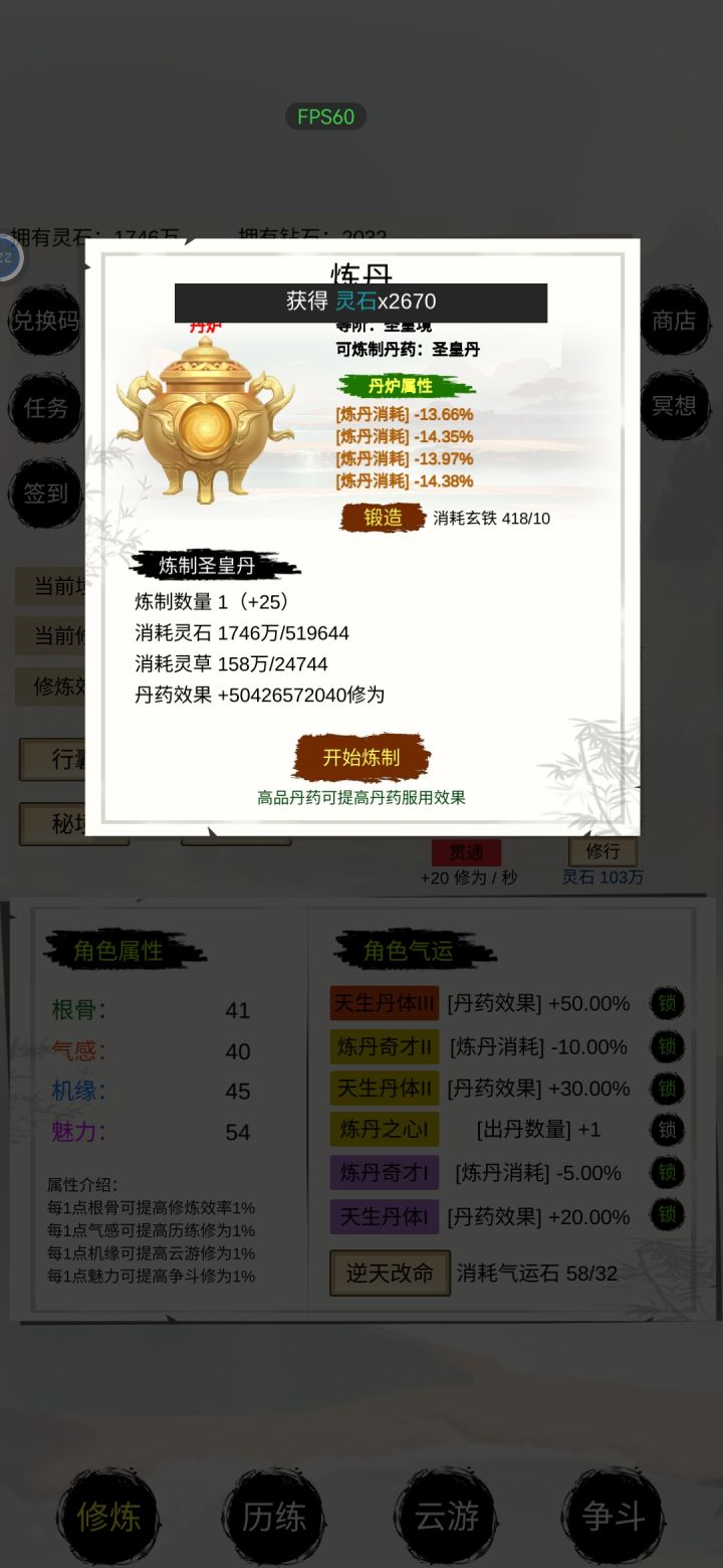 如果刚刚开局可以看看这个方法,把游戏卸载,然后把手机时间调至两个月前,再下载本游戏,最好搞个连点器,打开签到,可以一直签,建议晚上睡觉挂机的时候搞好一点,最好把钻石刷到5000万以上。注意:钻石刷满后先不要把时间调回去,用钻石买灵草,这很重要,至少买10亿灵草,能买多少买多少,后面炼丹的消耗很大的,而把时间调回去后就不能再调了,那一天就只能买20万颗完全不够用的。灵草买够了就可以把时间调回去了。