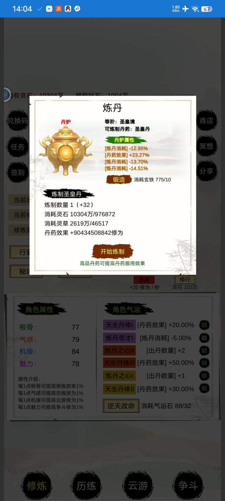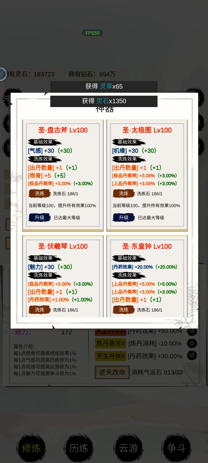 洗了几天,前期最完美的搭配是,神器全部洗出丹➕1,丹炉和角色气运以丹药效果为主(能丹药效果为主还有出丹数才是最完美的),后期神器等级高了以后,或许丹药效果才是最好的,但那是后面了