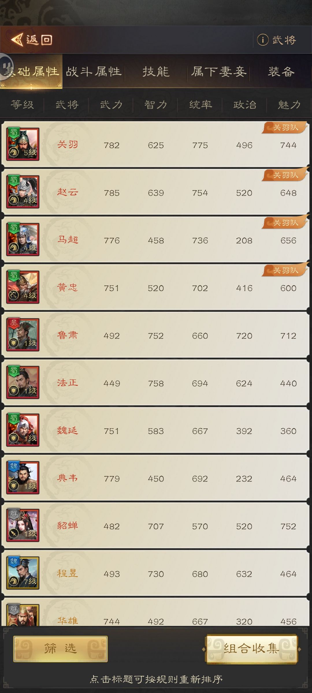 本篇针对新手全面讲述武将养成界面,如何进行强度提升(除妻妾、装备)快速入门! 1.基础属性: 武将独有且不可改变,天生资质。 武力、智力----物攻、谋攻; 统率----物防、谋防; 魅力、政治----寻访、委任。 2.战斗属性: 最重要!最重要!最重要! 所有提升直接作用于战斗属性! 注意:进入实战还会提升!(受将星、属性提升相关技能等影响) 3.忠诚: (1)只用道具一、二、三、四品酒提升,不