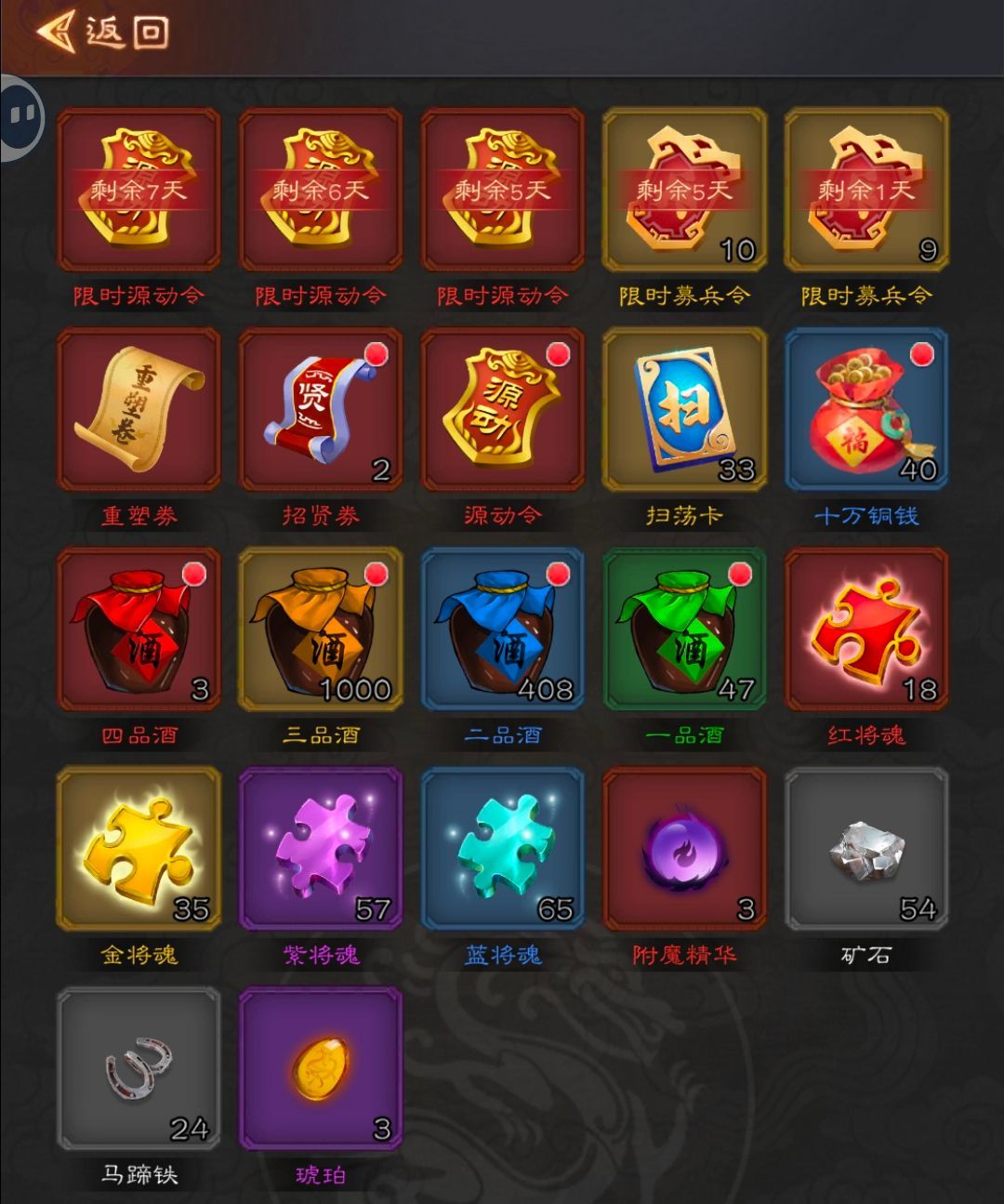 1.(限时)源动力: 用途:恢复所有武将满体力 获取:任务及活动获得、元宝商城购买 特别说明: (1)第一章开启的寻访,需消耗大量武将体力!佛系玩家可以留存给第一章使用。 (2)序章阶段没体力,又想肝,可以直接使用!快乐最重要! 2.(限时)募兵令: 用途:立即获得兵力 获取:任务及活动获得、元宝商城购买 特别说明: (1)消耗额外的铜币、资源,可消耗元宝额外增加兵力! (2)只能默认均匀分配,不