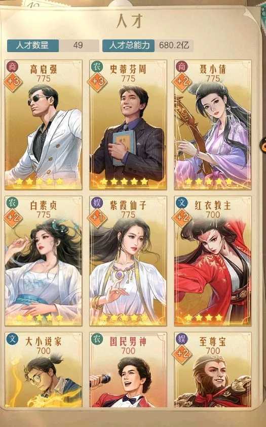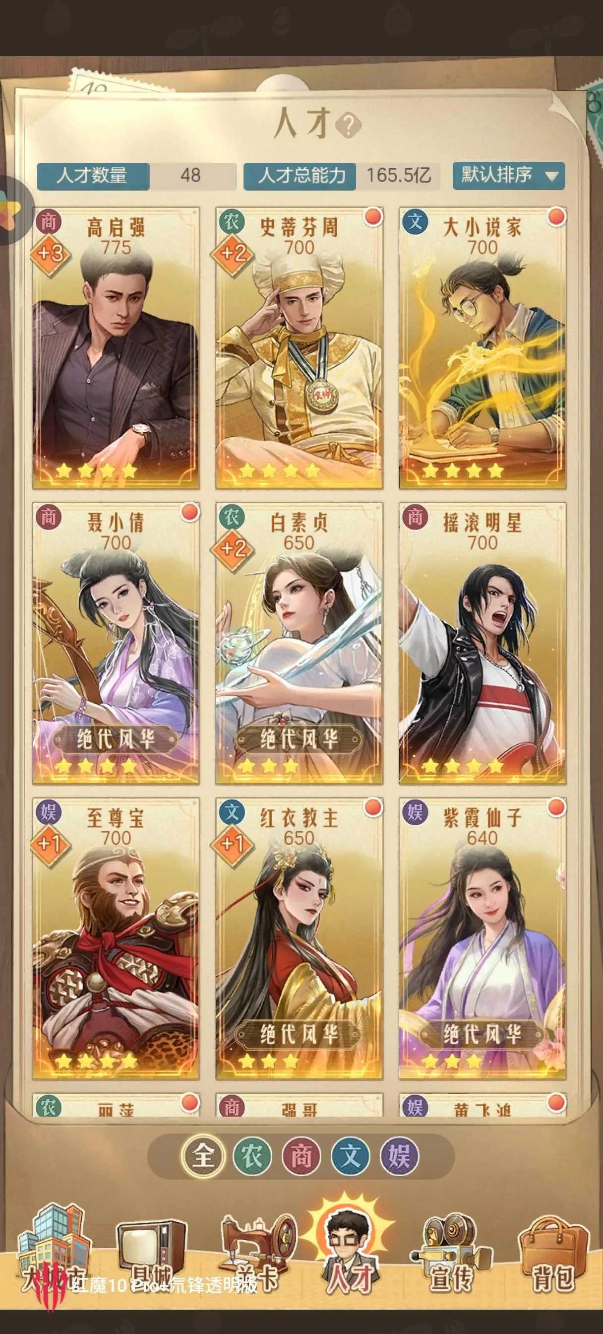开服第二天就了36元,现在秒入1.8w。首先新手玩家记住钻石一定不要抽奖,抽奖没有意义,抽奖里面的人才卡基本上活动个过关是可以达到的。第二点:吃席不要舍不得吃,吃席币可以兑换很多道具比钻石有用,吃席50次可以获得艺人3:兑换道具优先兑换火车票其次升级道具,然后财富经,小时卡分钟卡没必要兑换4:0氪微氪玩家第一个一定要换郑经理艺人换海燕,有羁绊加成,主玩培养她两!5:关卡一定要保证跟上本服玩