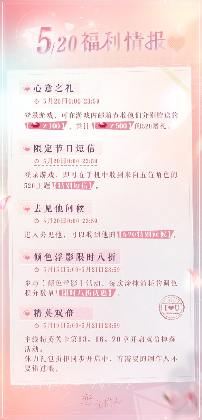 将欢欣融成色彩,填满每个值得纪念的日子。 【恋与制作人】2023年520福利一览 心意之礼 5月20日0:00~23:59, 登录游戏,可在游戏内邮箱查收他们分别赠送的【钻石*100】,共计【钻石*500】的520赠礼。 限定节日短信 5月20日0:00~23:59, 登录游戏,即可在手机中收到来自五位角色的520主题【特别短信】。 去见他问候 5月20日0:00~23:59, 进入去见他,可以收