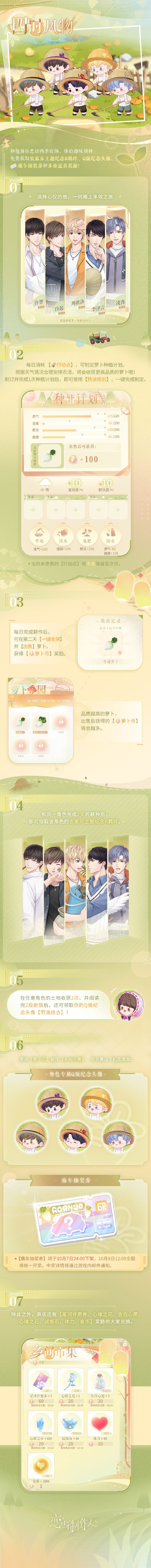 烟火乡间,浮生偷闲。 和他前往恋语四季农场、体验趣味耕种,免费获取农家乐主题纪念R羁绊、Q版纪念头像、痛车抽奖券等多重好礼! 活动时间:9月26日更新后~10月8日23:59 行动点:登录免费获得 活动期间,每日登录游戏,即可免费获得行动点、制定萝卜种植计划。 根据天气情况合理安排农活,将会收获更高品质的萝卜哦! *当日未使用的行动点将不会保留至次日。 体验趣味耕种:领取纪念羁绊&Q版头像 选择心