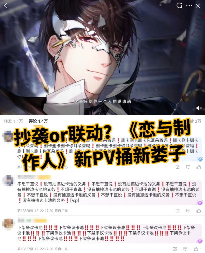 《恋与制作人》官方于今天12月22日发布的新活动预告PV“世纪预告函”,因视觉风格引发了大量玩家们的争议。玩家指出,其怪盗主题、黯红色调、网格背景、角色姿势以及“偷心”概念等设计,与经典游戏《女神异闻录5》的标志性元素高度相似。有玩家猜测或许是之前就做好的联动卡池,现在敏感时期带不了标,但联动卡池本身是不会单独复刻的,公告又说会复刻。看社区评论,大部分玩家还是认为该下架争议卡池,这个“擦边球”式
