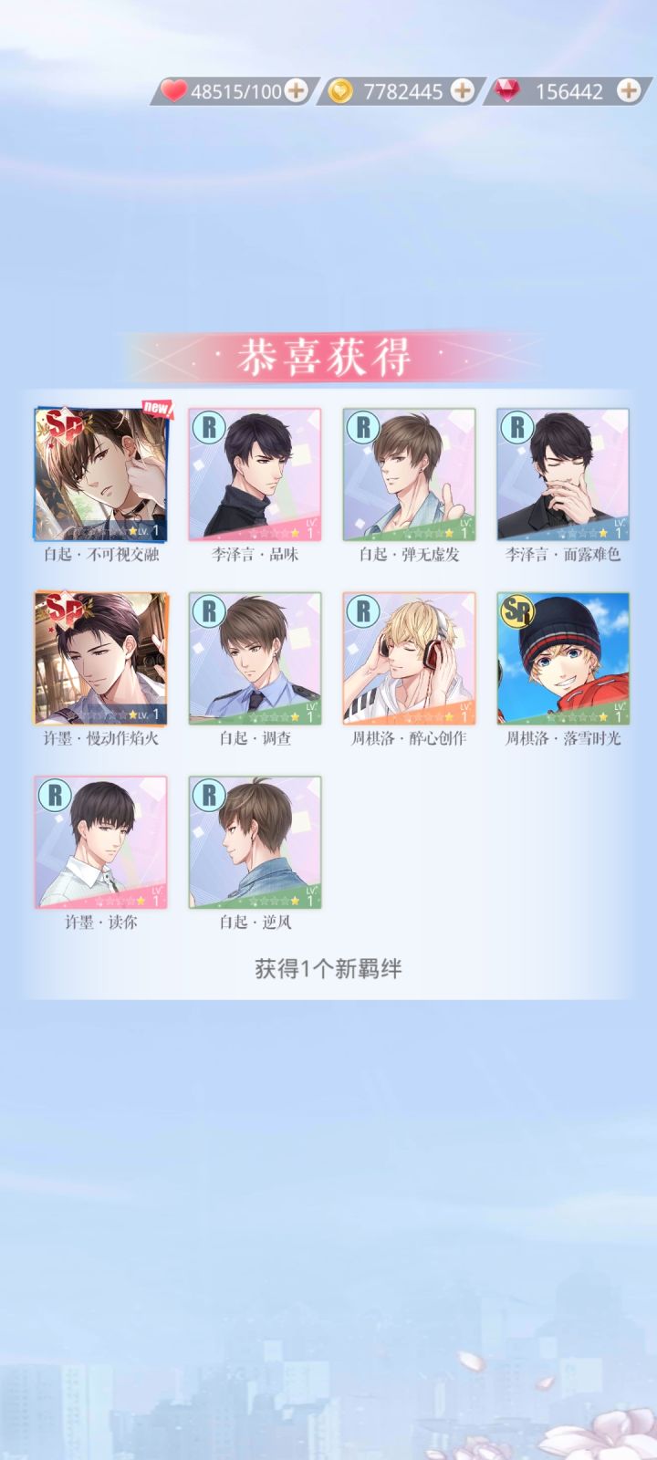 今天无意中看到一个帖子是玄学抽卡的,所以我按照那些方法试了一下,结果发现全都不适合我,于是深夜自己不死心又上线试了一试,结果欧到爆!我自己都不敢相信的那种!因为是有规律的,所以就想分享给姐妹们,希望姐妹们试了都能像我一样脱非入欧!先发一下图证明下自己,我是一共抽了55发,出了5sp+1ssr,4张活动都出齐了,还多送了一张许墨的(基本是我想要哪个就来了,没用这个方法前抽卡一直重复出一个人,哭死)