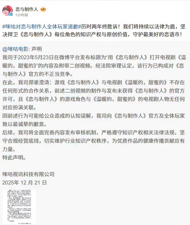 咪咕视频电影频道官方微博今日发布道歉声明,称法院审理认定,其 2023 年 5 月 23 日在微博平台发布标题为“用《恋与制作人》打开电视剧《温暖的,甜蜜的》”的内容及附带二创视频已构成对《恋与制作人》官方的不正当竞争。《恋与制作人》官方转发了该声明,并评论:“历时两年终胜诉!我们将持续以法律为盾,坚决捍卫《恋与制作人》每位角色的知识产权与原创价值,守护最美好的恋语市!”这个时间跨度,两年多的