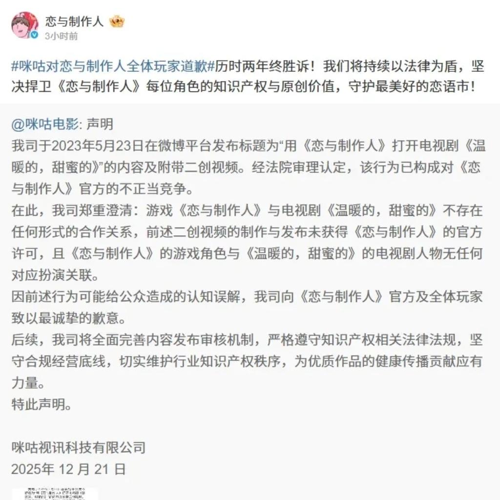 历时两年,咪咕视频终于在12月21号发微博道歉了。 这个事是关于他们之前搞的那个二创视频,乱用《恋与制作人》的东西。 2023年5月,咪咕为了推自己的电视剧,做了个视频,标题叫“用《恋与制作人》打开电视剧《温暖的,甜蜜的》”。 里面直接用了游戏四位男主的名字、PV片段、原创音乐、还有原版配音,搞得大家都以为是官方联动了。官方当然不能忍,直接就去告了,经上海市知识产权法院审理,该 “搭便车”#今天游戏圈发生了啥