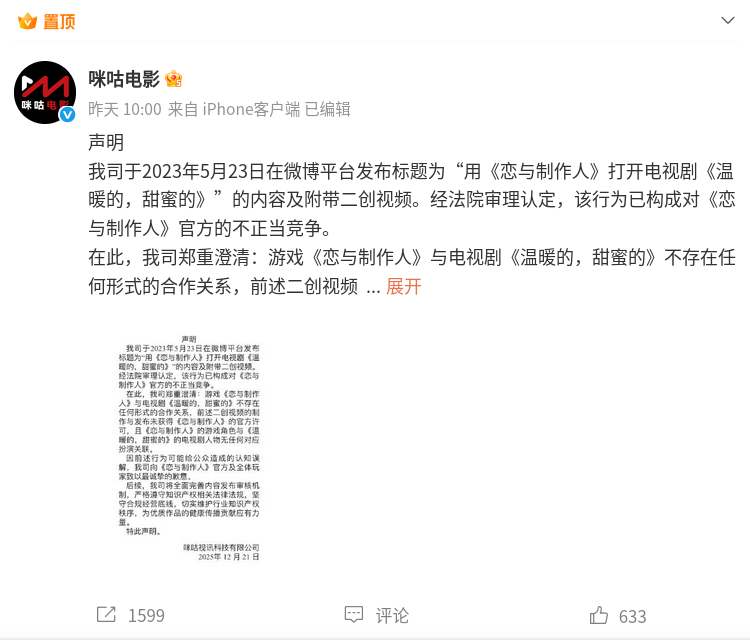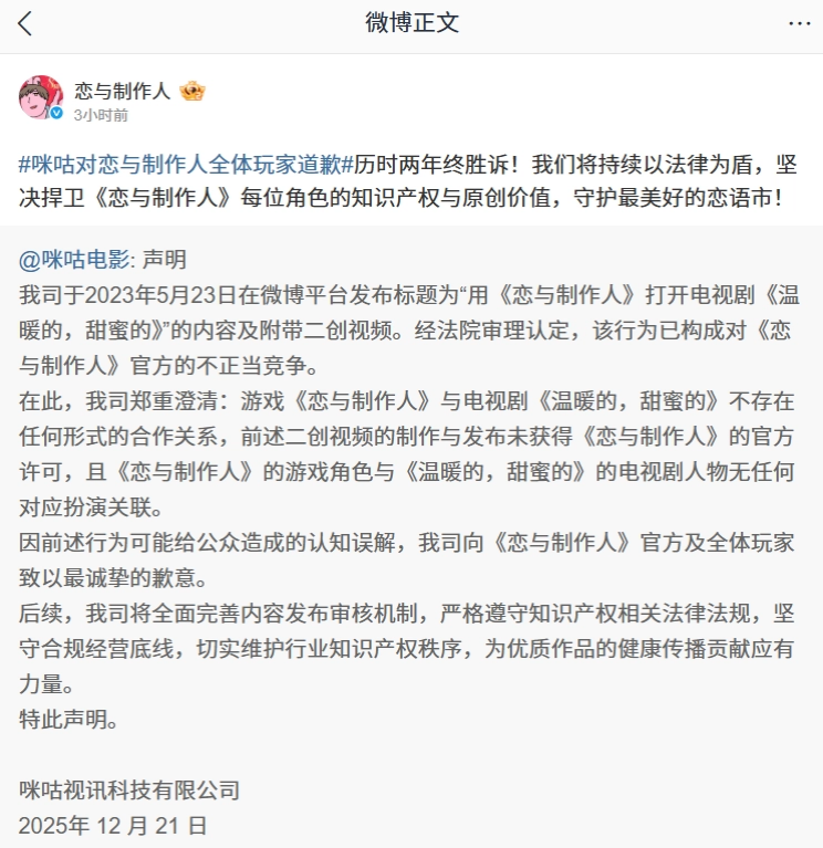 #今天游戏圈发生了啥 2025年12月21日,咪咕视讯科技有限公司通过“咪咕电影”官方微博发布致歉声明,承认其2023年5月发布的“用《恋与制作人》打开电视剧《温暖的,甜蜜的》”二创视频构成对游戏《恋与制作人》的不正当竞争。上海知识产权法院终审认定,该视频未经授权擅自关联两款作品,易引发公众误解,且二者角色无任何官方对应关系。声明中,咪咕强调已认识到错误,承诺完善内容审核机制,严格遵守知识产权