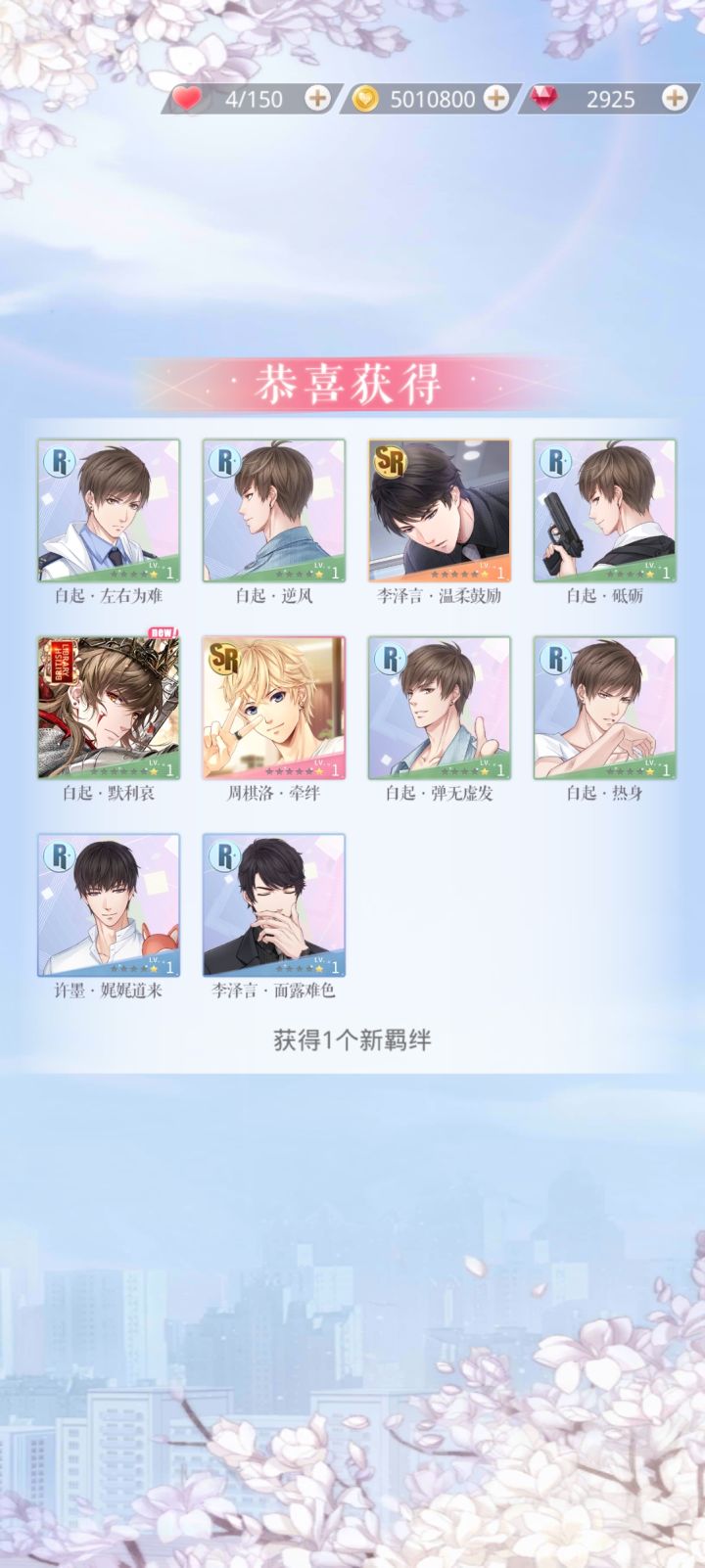 抽到八十抽一个卡都没的时候已经开始慌了(本双推并没有288能用来强娶)直到110出老李,我放心了。前面整百抽没出一个,在110抽出个双金真的是意外惊喜了做好强娶准备的许教授在120也出了那就强娶洛洛吧,全员拿下,圆满!