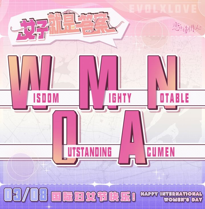 去过【女子】的人生吧——世界是你的疆土,天地任你拓宽。去追求【女子】的梦想吧——你的自信和强壮,就是女子本来的模样。妇女节福利今日登录游戏,即可收到来自恋语市政的【钻石*100】妇女节赠礼。祝各位制作人节日快乐,也祝福每一位女性才高八斗、孔武有力!节日话题——女子就是答案你是什么样,女子就是什么样。面对质疑和规训时,坚持身为女性的自我,就是最【好】的答案。分享你坚持自我、忠于自我的