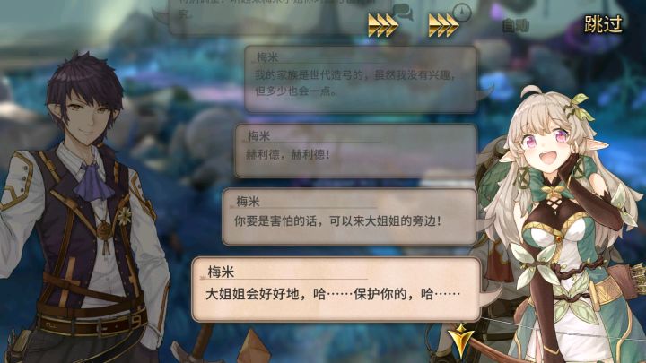 “捉~到你~了~哦~!”调皮的话音刚落,蹦出来了一个大眼萌妹。她叫梅米,是武器店里最活泼的存在,一个来自灵芙村的永远活力十足的少女。 她出身自擅长造弓的家族,是精灵村的警备队长。一反精灵排外的常态,她对外面的事物,尤其是可爱的东西,有着浓厚的兴趣和热情,毕竟“可爱就是正义”!梅米的交友能力相当强,遇上喜欢的人就会毫不保留地表达出自己的情感。在第一次见到赫利德时就觉得这个小正太特别可爱,从此一直跟