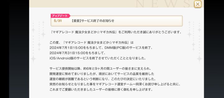 今天,日系游戏《魔法纪录 魔法少女小圆外传》官方发布消息,正式官宣游戏停运事宜!官方表示,游戏的日服 PC 版和手游版将分别于7月1日、7月31日停服。不管,停运后,官方将发布离线版本APP,供大家回忆。朋友们,都玩了多久这款游戏呢?#今天游戏圈发生了啥 #吃瓜爆料 #游戏资讯