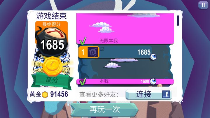 游戏的大关的设定是你只有一条命的机会去收集足够的眼球。那么大家游玩的时候肯定会遇到,好不容易快收集完成的时候阵亡了,或者后期的关卡难度太高导致难以一命收集的情况。这里提供大家一个邪道的速通方法。就是当你每一次阵亡的时候,如下图。又没有复活币?不要紧张,点开你的手机任务管理器,将游戏进程关闭再重新登陆。你将会以0血的模式得以继续进行大关收集而不是眼睛数量被清零。理论上你可以无限刷眼睛数量,