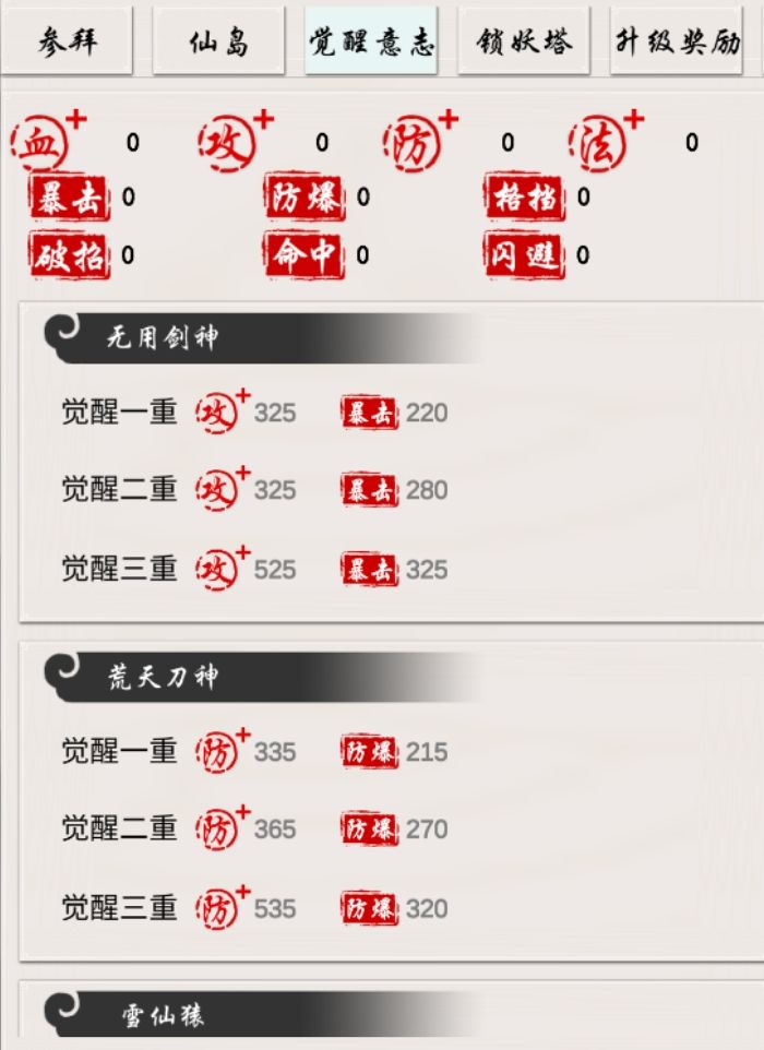 觉醒的弟子越来越多,一些觉醒弟子扔在仓库,没有办法发挥价值.觉醒意志则在一定程度上弥补了这个缺憾.每一名觉醒弟子,根据他的每一重觉醒,都对应了一个四维或二级属性加成.宗主可以消耗一定数量的仙酿,来激活觉醒弟子对应重数的加成.仙酿的消耗规则为,无论激活任何弟子和重数,第一次激活消耗1个,第二次消耗2个,第三次消耗4个,以此类推,直到消耗等于512,此后激活消耗会恒定为512不变.如果仙娘足