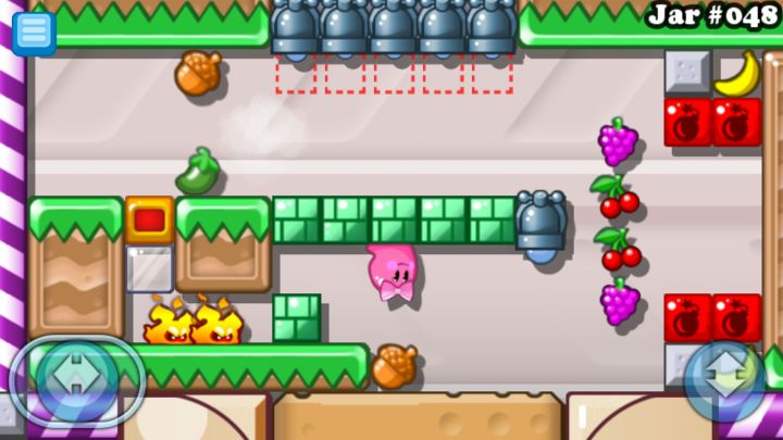 你要等他们往后一点 然后你就去撞那个蓝色的那个然后快速跑过去跳上去吃辣椒然后等一只怪兽过去你就跳下去把另外两只搞掉然后去滴水吃水果就好