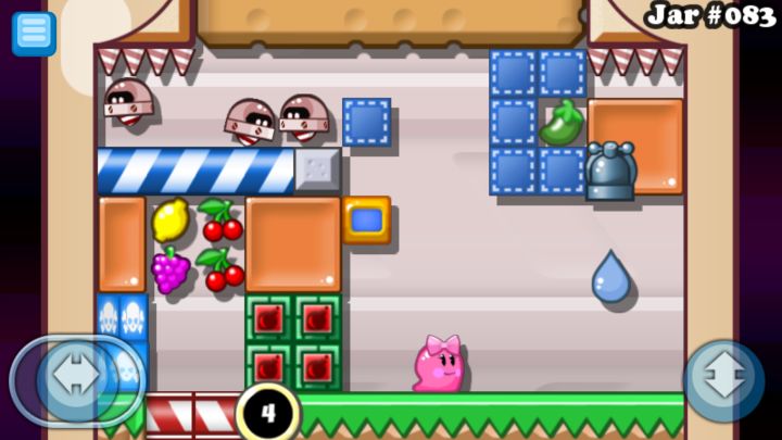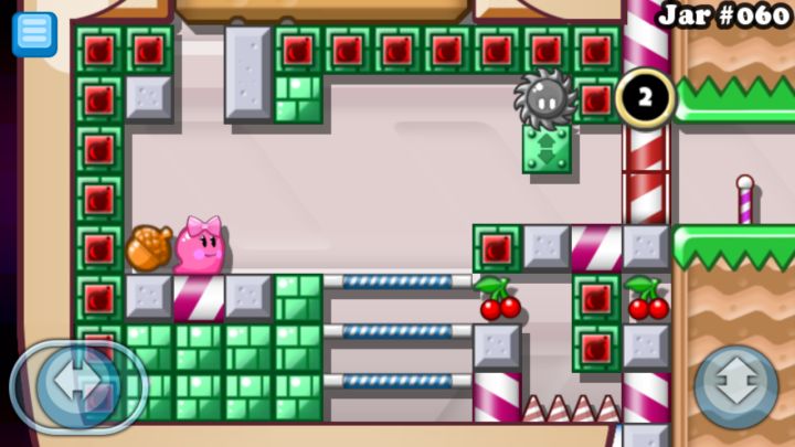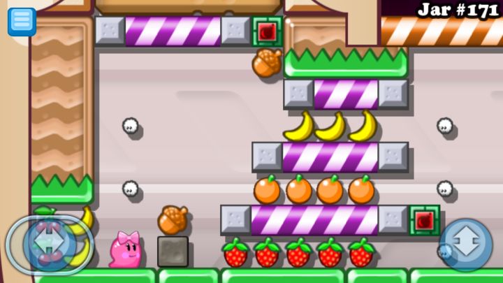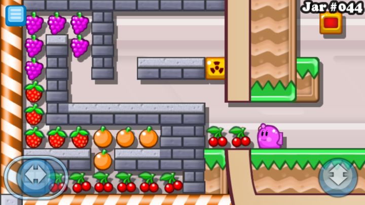 绕到左面去打碎玻璃板把那个绿色的←→推到on/off按钮上再到右面去把靠近绿色按钮的那个←→推到按钮下面在红按钮下面跳一下再跳回来(不要碰到炸弹和刺)再回去中间吃水果就ok啦