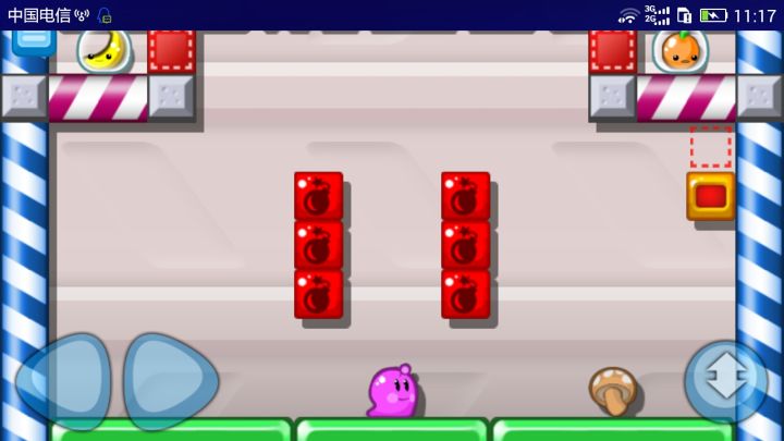 这里有个难点,要求时间把握,上去吃掉变形和辣椒,这个时候会变成方块火焰状态。接着站在上面水龙头左一那个头的左边一个格子,细节来了1,水珠在准备掉下来的时候右移一格然后往下把砖块炸了,掉下去之后立马跳起来翻身贴在水龙头下方的砖块底部,有了火焰状态,把右边红色炸弹搞掂就轻而易举了注意,右边的那一竖水果要留最上面那个不吃,不然吃了坚果,你也没办法带出来,因为坚果状态只能直上直下