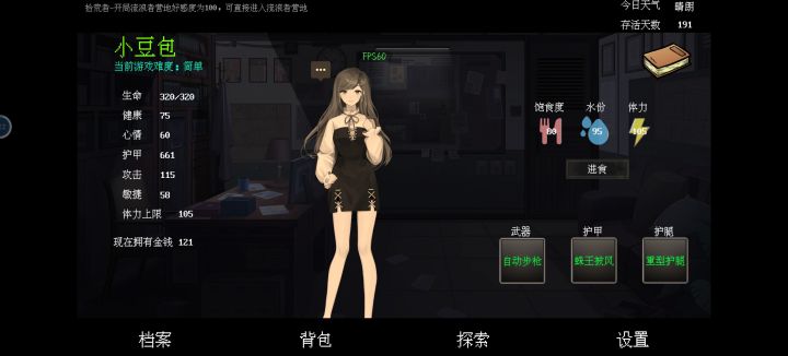 另外说一下,游戏本身一点点偷懒的地方都没有,除了一个自动吃东西以外(但是也鸡肋,没有用),自动战斗没有,一键跳过也没有,这两个东西我觉得十分有必要,因为护甲值高了,怪物连我皮肉都没破就被打死了,这么简单都还需要我去点点点,麻烦得很。