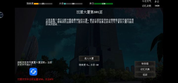 我知道超新星很猛,但没想到这么猛,能无伤100层开始挑战双星大厦后会变得缺水(甚至烤肉也可能见底),建议尽快将锻炼拉满并将床升级成休息仓(每天150体力,如果有猛士选消防员则200体力)。每次进食补水请注意烤肉和矿泉水的库存(甘蔗在这个阶段会快速清零,还是得储备大量污水和矿泉水)在紧急(脸黑)情况下可以使用变更信号枪一键下雨起雾(不会有人在120天后都合不起信号枪吧)25-32层是究-困难下