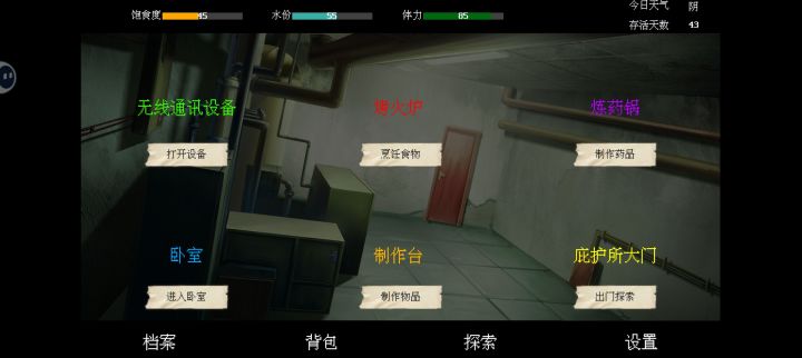 游戏有生存类游戏的体力、心情、水分和饱食度数值,玩家通过探索和种植获得食材,食材可以烹饪成不同级别的食物,恢复这四个项数值。通过点击探索还能够获得各种材料,材料用来升级庇护所等级和制作装备,越高级的装备,打怪越容易。玩家最初的目标是存活120天,等待救援队到达,对新手来说还是有点难度的,但这只是其中一个结局,作者在游戏中加入了十几种职业和结局(部分还处于大饼状态),玩家可以通过多周目解锁成就、